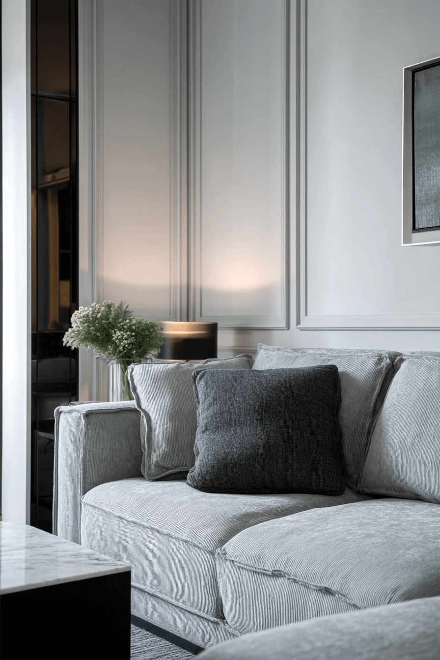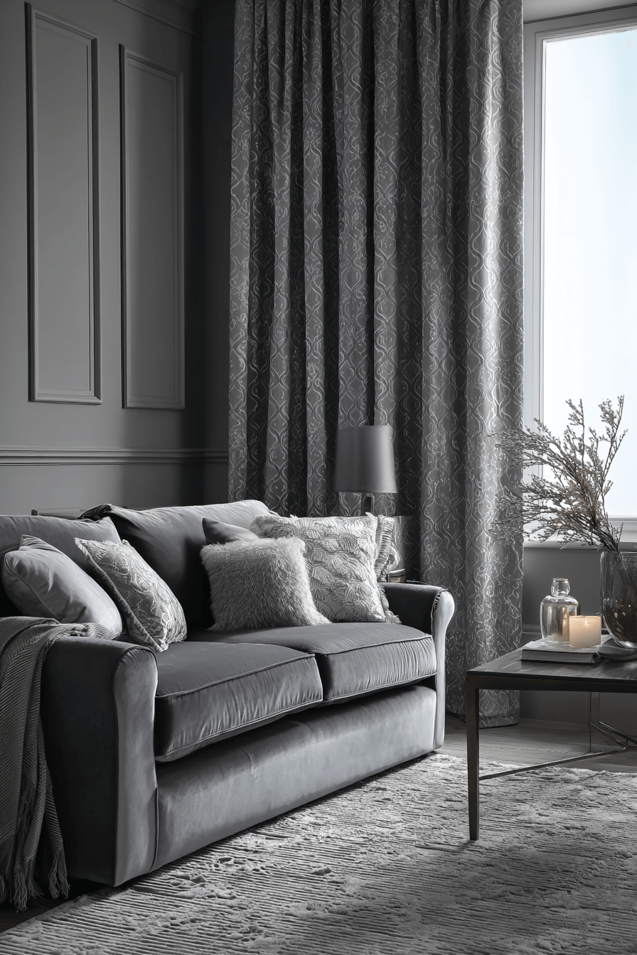 Using multiple shades of grey can make a grey couch living room feel layered, calming, and especially sophisticated. Charcoal, silver, ash, and dove tones in pillows, throws, and rugs add beautiful depth while preserving a unified look. Texture becomes the key to keeping the room visually rich and inviting. The grey sofa blends naturally into this palette while still anchoring the whole space. The final design feels serene, elegant, and full of subtle dimension. Explore more monochrome inspiration for your grey couch living room today!