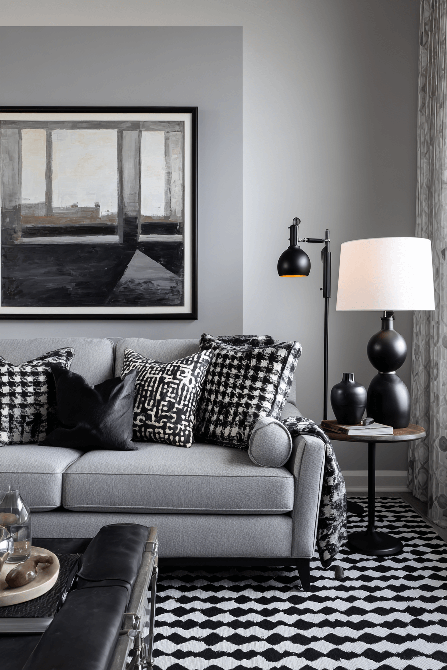 Strong black accents can give a grey couch living room a bolder, more defined look. Dark frames, matte lamps, and sharp-lined decor contrast beautifully with the softer tone of the sofa. This pairing creates structure and makes the room feel more modern and intentional. Minimal furniture and simple styling keep everything feeling polished rather than heavy. The final result is dramatic, balanced, and effortlessly chic. Discover more bold black-accent ideas for a grey couch living room!