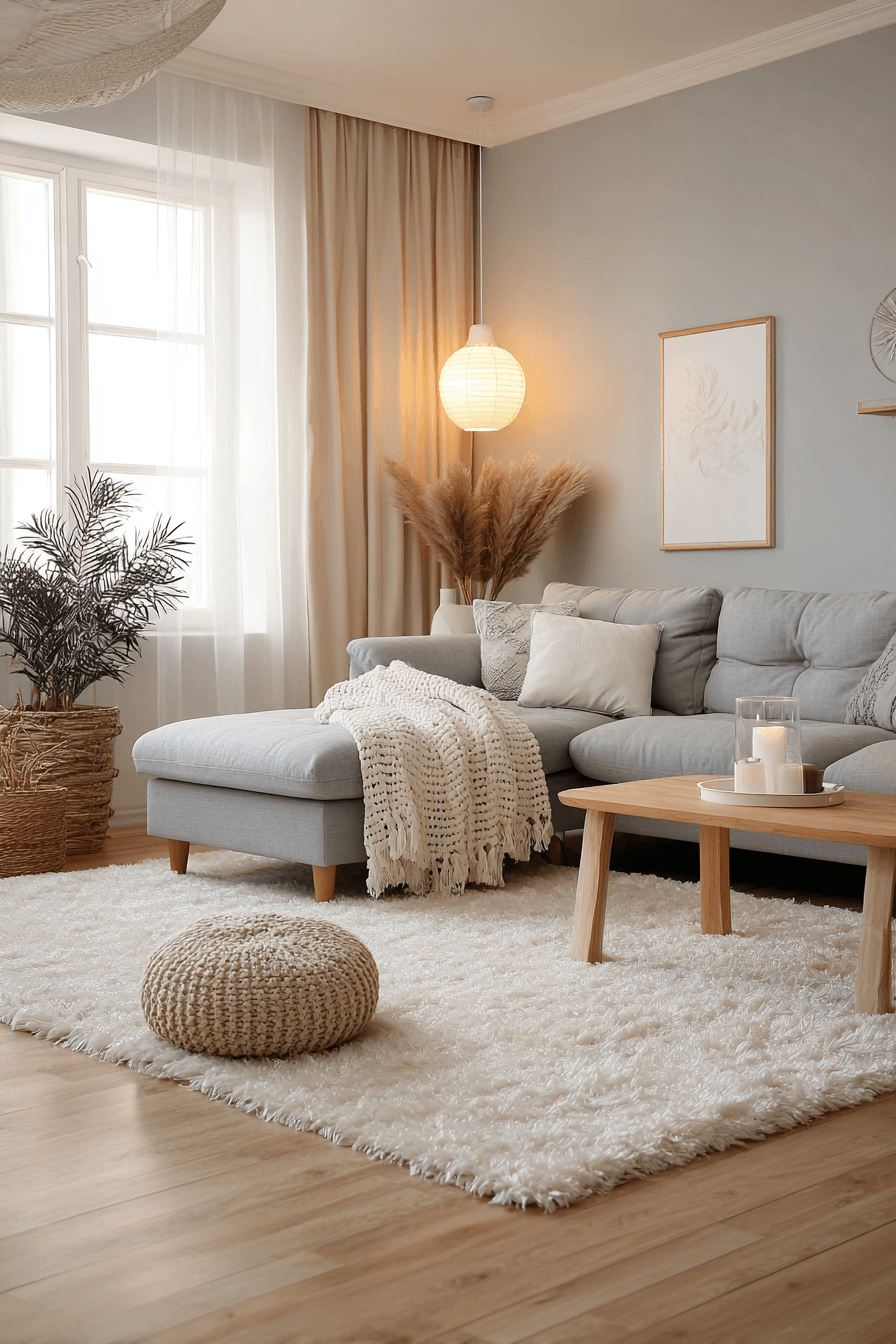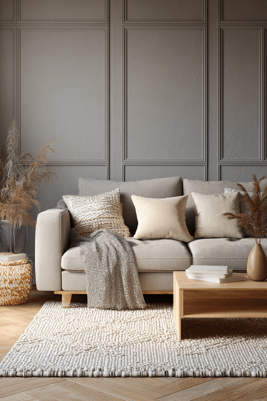 Soft textures and warm neutrals can make a grey couch living room feel instantly more inviting and lived in. Cushions in cream, taupe, and oatmeal add gentle contrast while staying within a soothing palette. Layered throws, plush rugs, and subtle woven details create warmth without sacrificing elegance. The grey sofa grounds the room while the surrounding finishes soften the overall look. The final atmosphere feels cozy, calm, and beautifully relaxed. Tap to explore more warm neutral ideas for a grey couch living room!