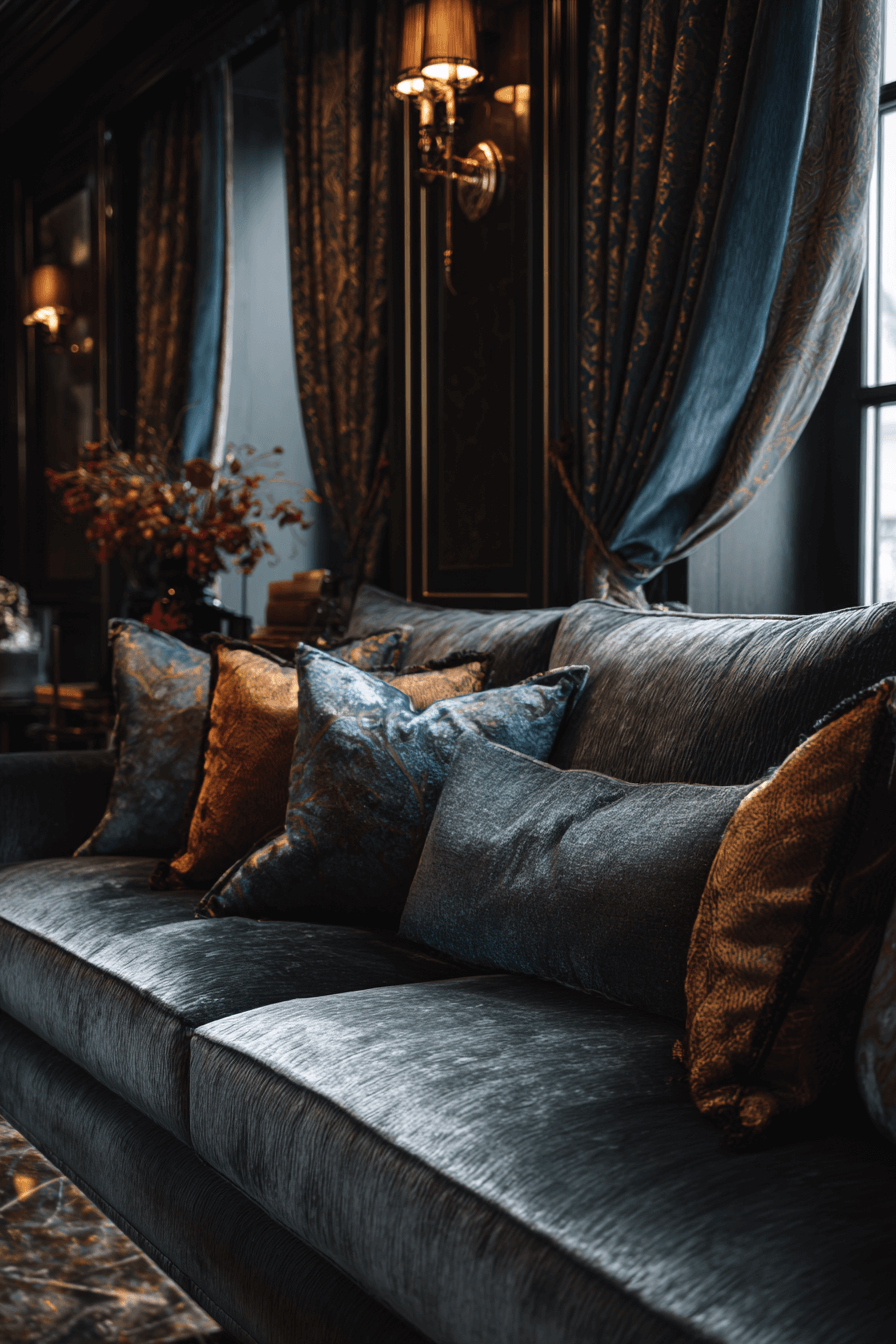 Velvet can bring instant richness to a grey couch living room and make the space feel more luxurious. A plush grey sofa or jewel-toned velvet cushions add softness, depth, and a subtle sense of glamour. Metallic accents and glossy decor pieces can enhance the elegant feel even further. The texture keeps the room feeling warm and indulgent while still maintaining a polished edge. The result is cozy, sophisticated, and visually stunning. Tap to explore more inspiration for a luxurious grey couch living room!