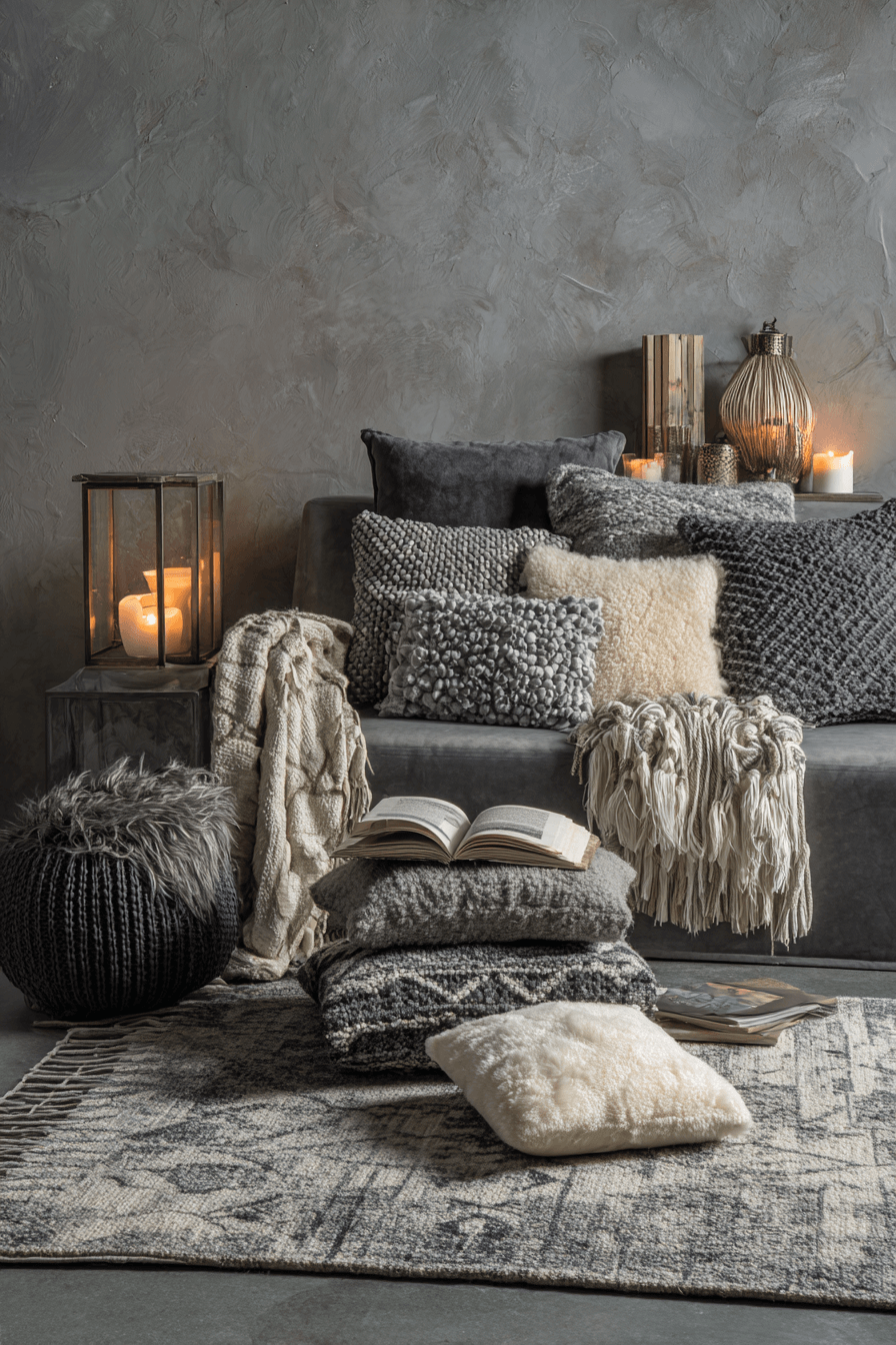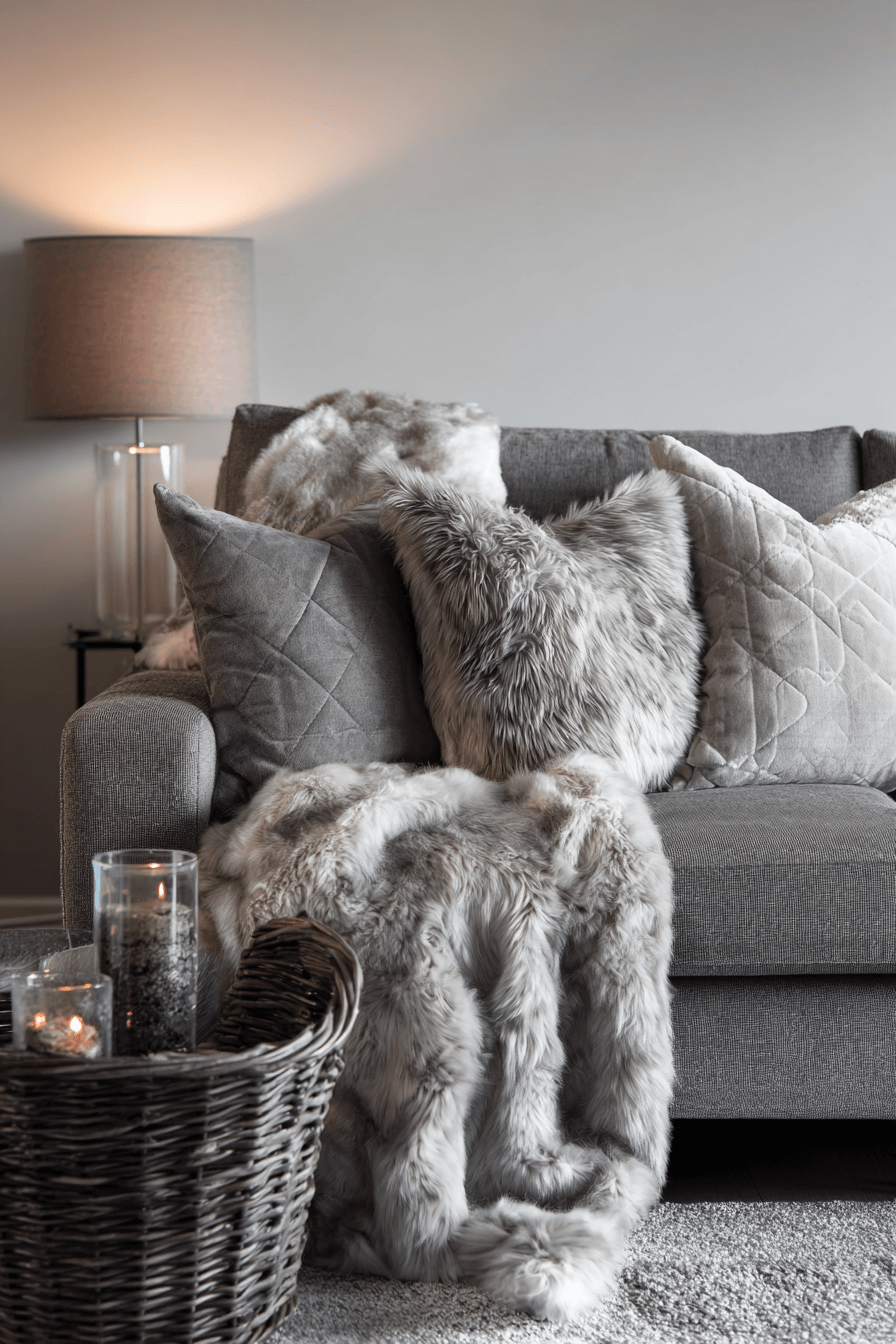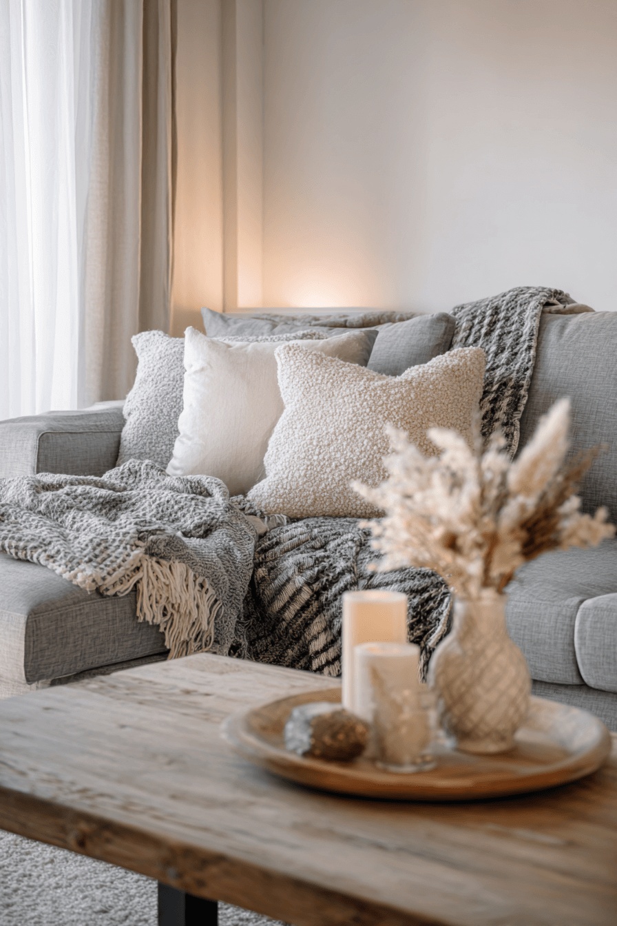 Plush textiles can make a grey couch living room feel irresistibly cozy while still looking polished. Soft pillows, layered blankets, and chunky throws build comfort around the sofa in a way that feels warm and stylish. A thick rug underfoot adds another level of softness and helps complete the inviting atmosphere. Mixing materials like wool, velvet, and cotton creates visual depth without clutter. The final result feels comfortable, elegant, and easy to unwind in. Explore more cozy textile inspiration for your grey couch living room today!