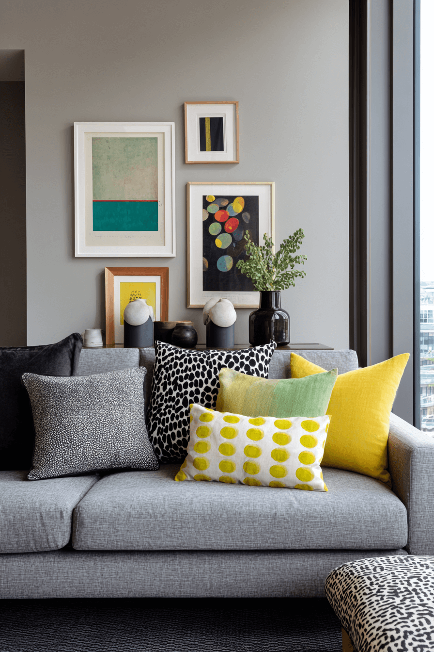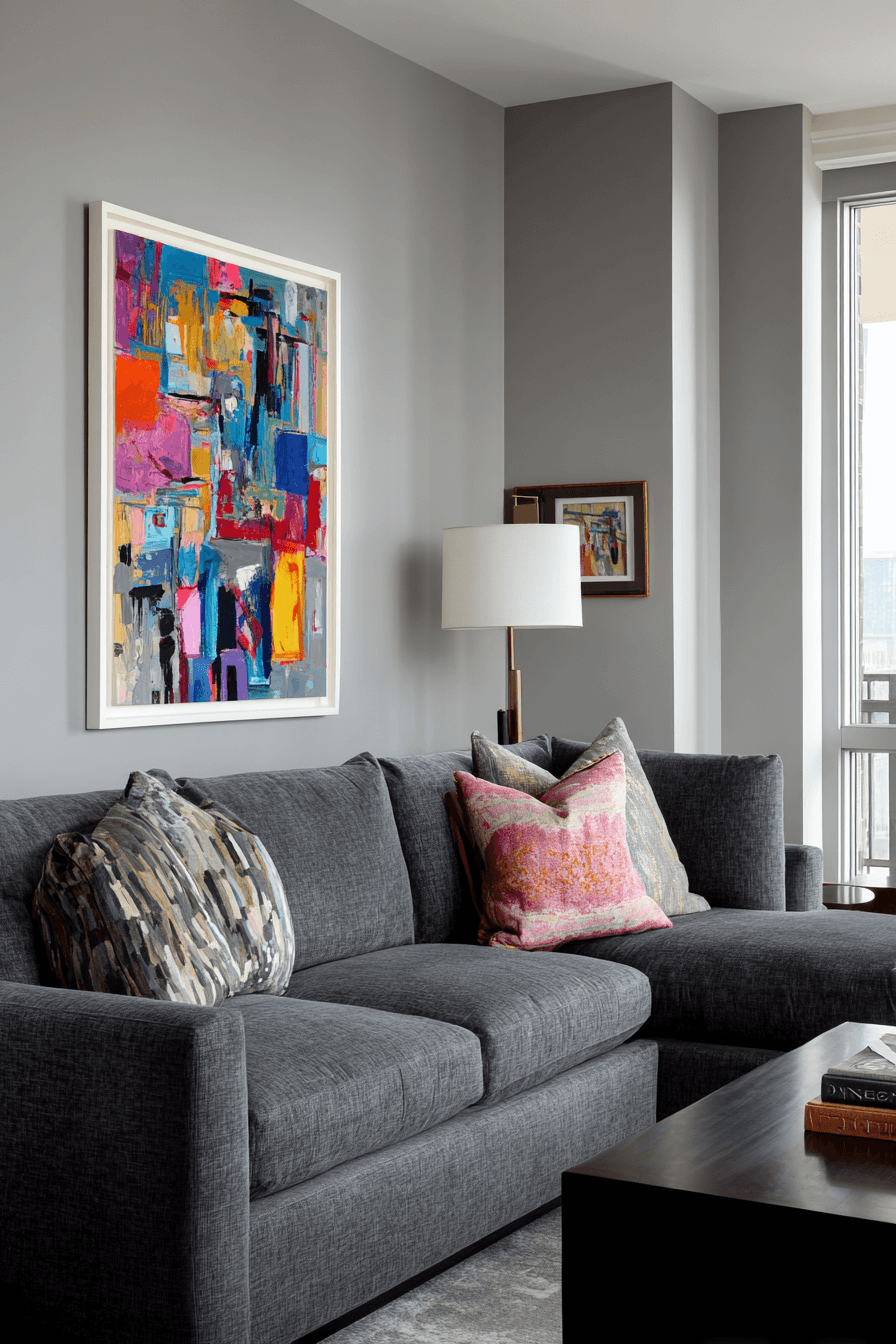 Expressive artwork can give a grey couch living room a vibrant focal point without overwhelming the space. The sofa provides a quiet neutral backdrop that makes bold paintings and colorful prints stand out beautifully. Minimal furniture keeps the arrangement feeling open and intentional. Small textural details can support the look while allowing the artwork to remain center stage. The final effect is creative, lively, and thoughtfully styled. Click to discover artistic ways to style your grey couch living room!