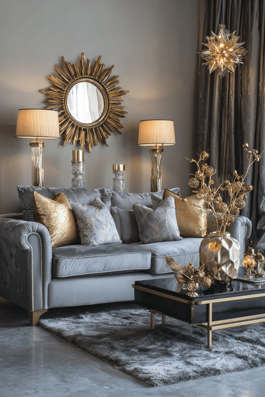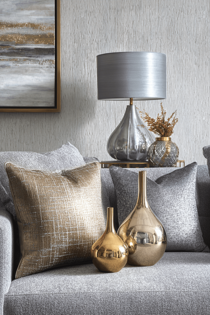 Metallic finishes can add a polished edge to a grey couch living room while keeping it modern and elegant. Gold, chrome, or silver decor catches the light and creates beautiful contrast against soft grey upholstery. Small details like trays, lamps, or frames can make a big impact without overwhelming the room. Clean silhouettes help maintain a sophisticated and balanced feel. The final look is chic, elevated, and effortlessly refined. Explore more metallic styling ideas to elevate your grey couch living room today!