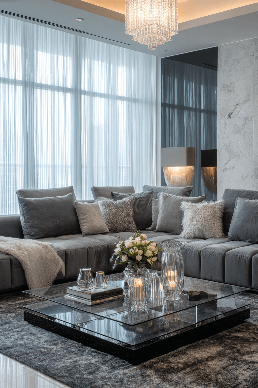 Glass accents can make a grey couch living room feel lighter, brighter, and more polished. Clear coffee tables, crystal-inspired decor, and transparent lamps keep the room from feeling visually heavy. The grey couch remains the grounding feature while the glass adds openness and elegance. This pairing works especially well in clean modern spaces that need a touch of softness. The final look is airy, chic, and beautifully composed. Discover how glass details can elevate your grey couch living room design!