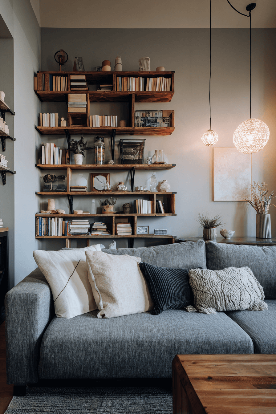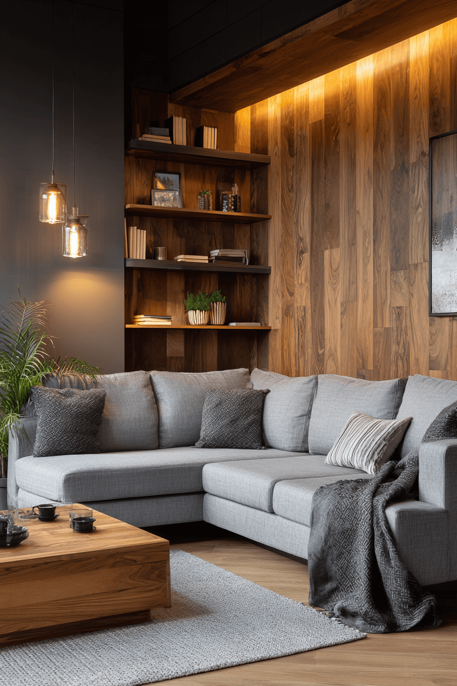 Natural wood tones can bring warmth and softness into a grey couch living room in a very timeless way. Wooden tables, shelving, and side pieces create an earthy contrast that works beautifully with the cooler tone of the sofa. Soft lighting and layered textiles make the room feel even more welcoming. This mix of wood and grey blends natural charm with modern simplicity. The finished space feels cozy, grounded, and easy to enjoy every day. Tap to explore warm wood styling ideas for your grey couch living room!