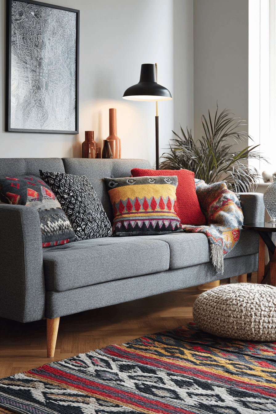 Bright pops of color can give a grey couch living room a playful and energetic personality. Vivid cushions, colorful art, and bold decorative accents stand out beautifully against the neutral sofa. The grey base keeps the design feeling grounded, which makes it easier to use brighter shades with confidence. Simple furniture and subtle patterns help everything feel cohesive. The final effect is fresh, fun, and stylishly balanced. Discover more colorful ways to energize your grey couch living room!