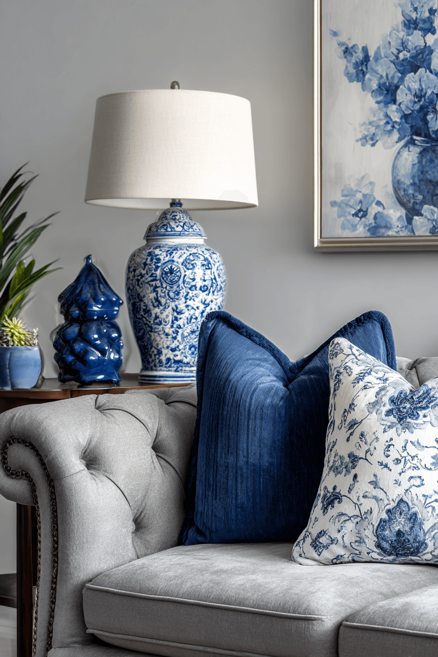 Gentle blue accents can give a grey couch living room a peaceful, graceful mood that feels inspired by calm skies and quiet water. Blue pillows, art, and decorative objects add color in a way that still feels soft and sophisticated. The cool tones naturally pair with grey, creating a palette that feels balanced and easy on the eyes. Light layering through fabrics and texture keeps the room from feeling flat. The final effect is serene, refined, and beautifully cohesive. Click to explore more blue-inspired styling for a grey couch living room!