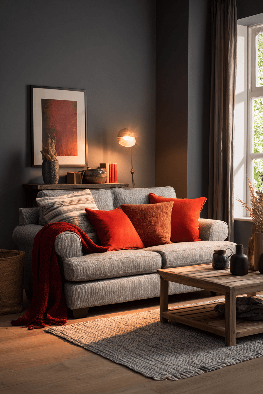 Warm shades like rust, terracotta, and deep cinnamon can bring life and coziness into a grey couch living room. These earthy accents create beautiful contrast against the coolness of the sofa and make the whole room feel more inviting. Wood furniture and warm ambient lighting strengthen the relaxed, comfortable mood even more. The grey couch keeps the palette grounded while the richer tones add personality. The final space feels welcoming, stylish, and full of warmth. Explore more warm-toned inspiration for a grey couch living room that feels extra cozy!