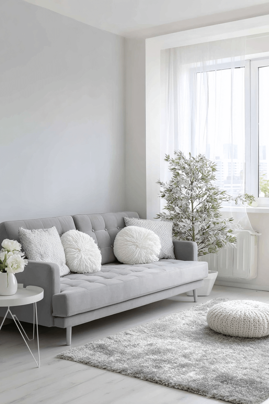 Crisp white details can make a grey couch living room feel bright, fresh, and incredibly airy. White rugs, clean-lined tables, and light accessories create a sharp but soft contrast that highlights the sofa beautifully. The simplicity of the palette helps the room feel open and calm instead of crowded. Minimal decor keeps the styling modern and uncluttered. The result is a space that feels light, elegant, and wonderfully effortless. Discover more ways to style a bright and airy grey couch living room today!