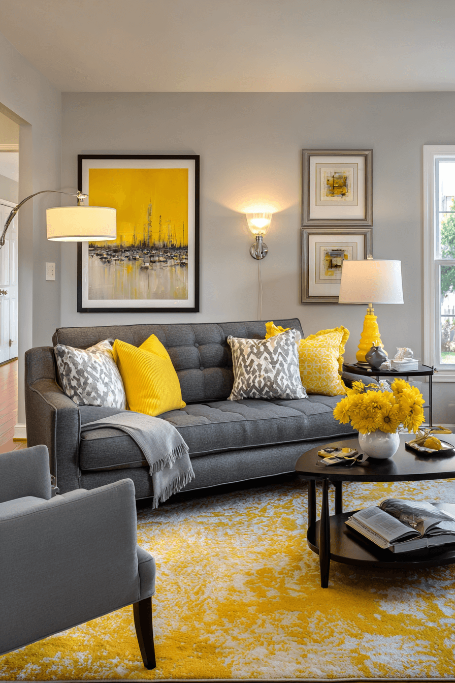 Yellow accents can bring cheerful energy to a grey couch living room without taking away its sophistication. Sunny pillows, bold vases, and bright artwork create playful contrast against the calm neutral base. Because the sofa is understated, the brighter touches feel exciting rather than overwhelming. Soft textiles and layered finishes keep the room comfortable and balanced. The overall effect is lively, stylish, and full of personality. Click to discover more yellow-accent ideas for a vibrant grey couch living room!