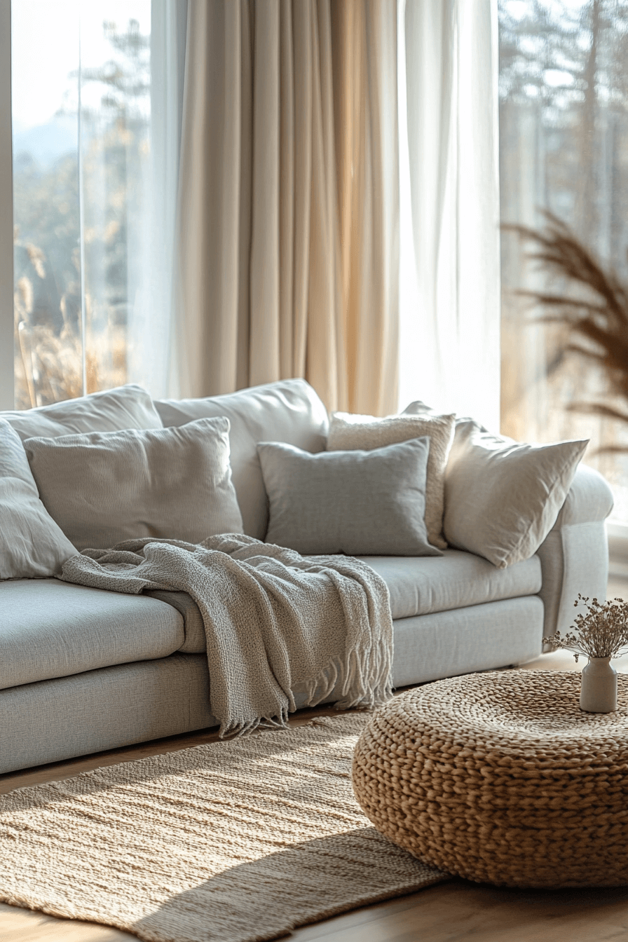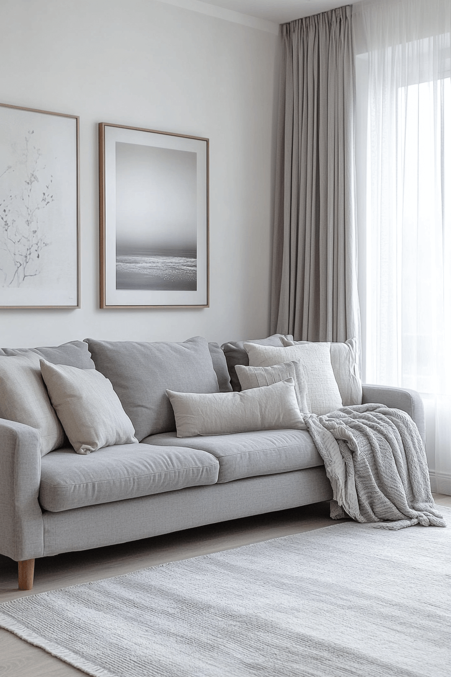 Airy grey sofa living room ideas make interiors feel open, fresh, and bright. Sheer curtains, expansive windows, and light flooring amplify natural light. The grey sofa pairs perfectly with white and soft pastel accents. The space feels joyful, spacious, and uplifting. Ideal for sunlit, clean interiors. Brighten your lounge with airy grey sofa living room ideas today!