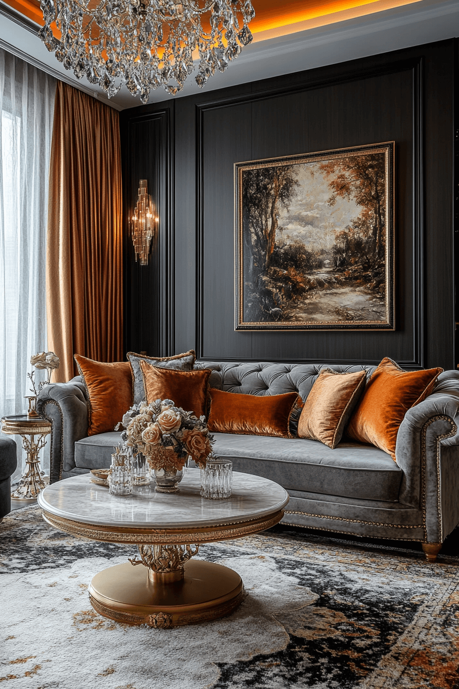 Luxe grey sofa living room ideas create dramatic, glamorous impact. Jewel tones, plush fabrics, and metallic accents bring elegance and sophistication. Statement lighting and ornate décor elevate the grey sofa as a centerpiece. The overall feel is lavish, expressive, and confident. Indulge in luxurious grey sofa living room ideas and let your space shine!
