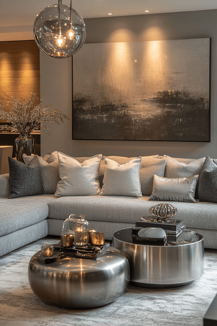 Metallic accent grey sofa living room ideas elevate style with subtle shimmer. Chrome, pewter, or brushed silver details reflect light beautifully. Slim furniture frames and lighting accents enhance the room without clutter. The grey sofa provides grounding neutrality. The overall aesthetic feels polished, modern, and elevated. Add luminous charm with metallic grey sofa living room ideas today!