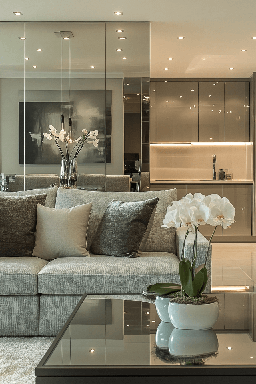 Reflective grey sofa living room ideas amplify light and create visual depth. Mirrors, glass tables, and glossy accents spread brightness throughout the space. The grey sofa balances sleek reflections for harmony. Works perfectly in smaller rooms to create openness. The space feels modern, refined, and expansive. Elevate your living room with reflective grey sofa living room ideas today!