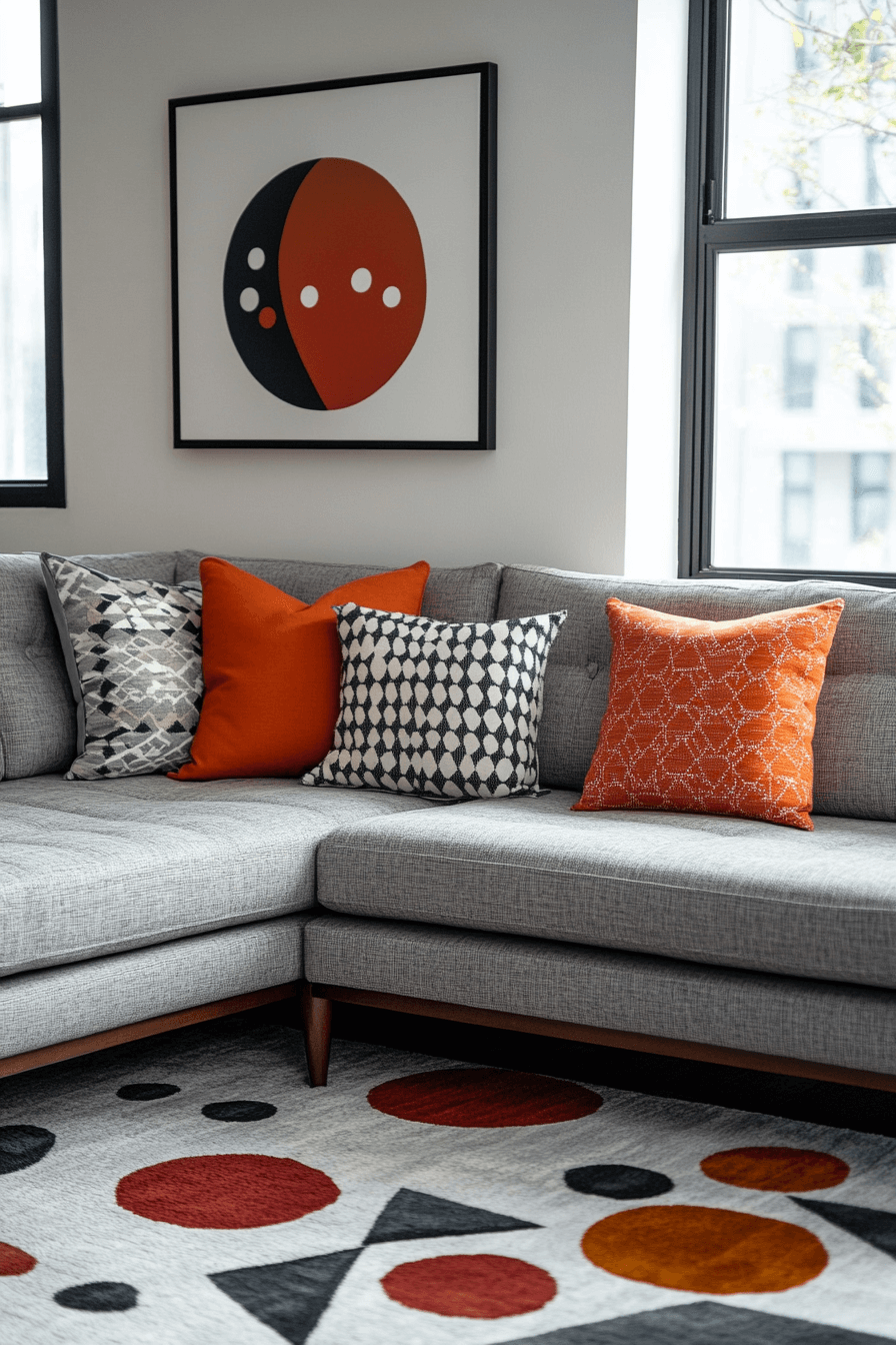 Geometric grey sofa living room ideas create modern visual energy. Patterned rugs, statement pillows, and bold art introduce structure and playfulness. The grey sofa anchors the design and balances contrast. Crisp lines and angular shapes keep the space contemporary and dynamic. The room feels lively, stylish, and modern. Energize your interiors with geometric grey sofa living room ideas today!