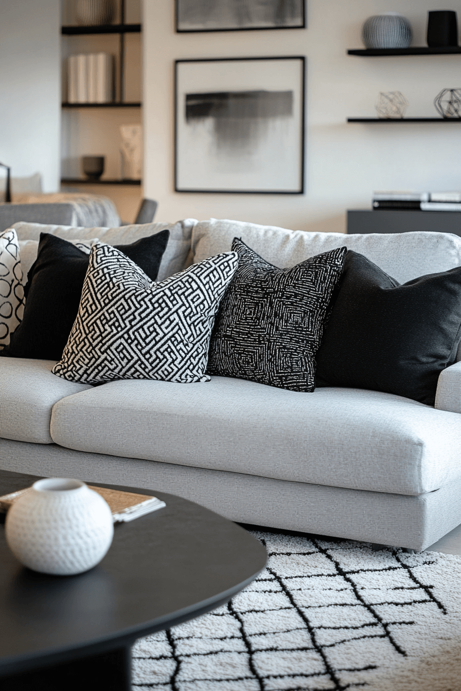 Monochrome grey sofa living room ideas embrace dramatic sophistication. Layering greys, black, and white creates a striking, cohesive foundation. Statement cushions and graphic artwork add character while keeping the space refined. The contrast feels bold yet timeless. The grey sofa becomes the understated anchor of the design. Elevate your interiors with monochrome grey sofa living room ideas today!
