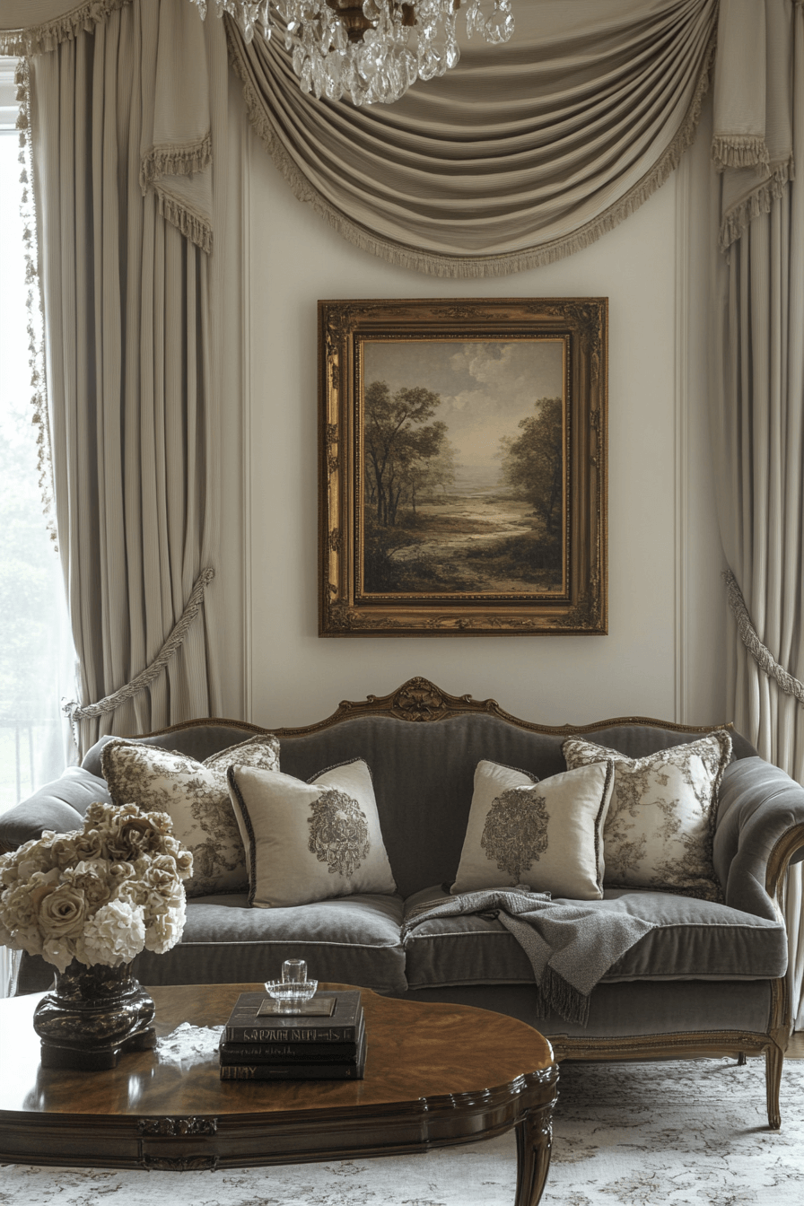 Elegant grey sofa living room ideas highlight timeless sophistication. Velvet, silk, or plush fabrics add rich texture alongside wooden furniture. Classic patterns and refined accents introduce depth and character. The grey sofa anchors the space beautifully. The overall look feels graceful, inviting, and enduring. Refresh your interiors with elegant grey sofa living room ideas today!