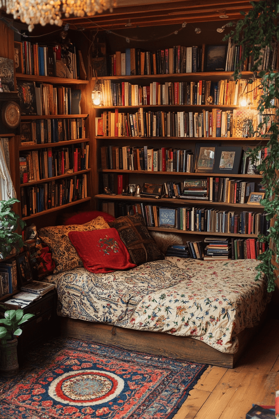 Library guest room ideas combine cozy rest with intellectual charm. Shelves of books frame a comfortable reading nook, filled with ambient light. Rich textures and vintage accents add storybook warmth. It’s elegant yet approachable.