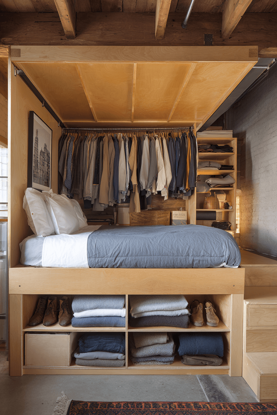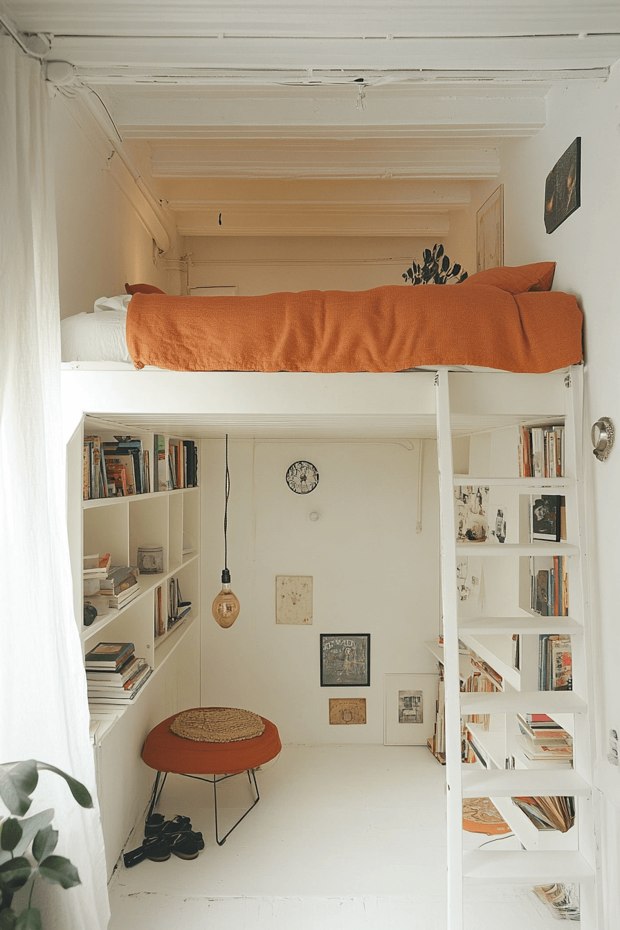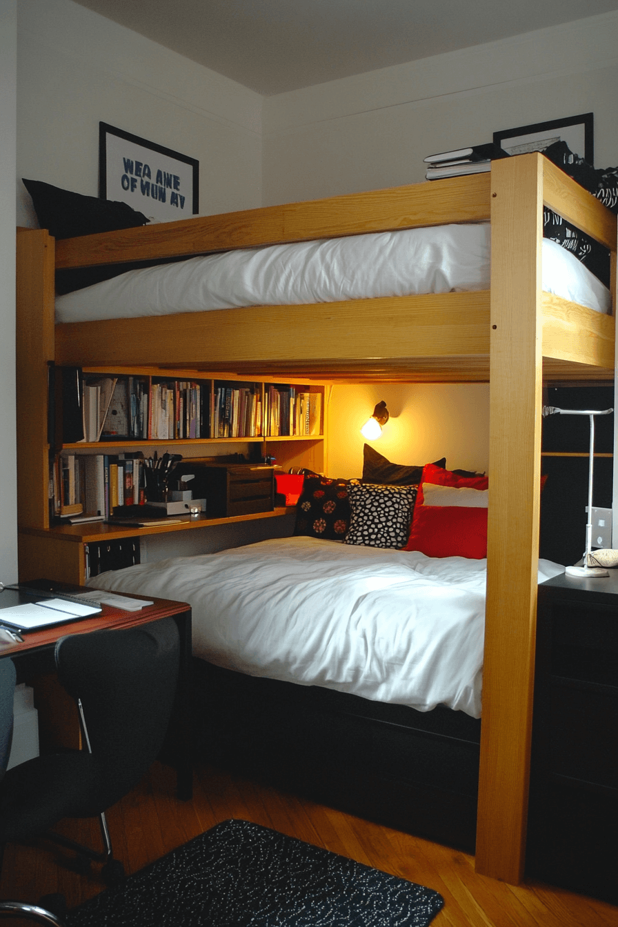 Integrated wardrobe storage makes this layout highly efficient. Loft beds for small rooms work seamlessly when clothing storage lives underneath. Daily routines feel streamlined and organized. The room stays uncluttered and cohesive. Style and practicality align beautifully.