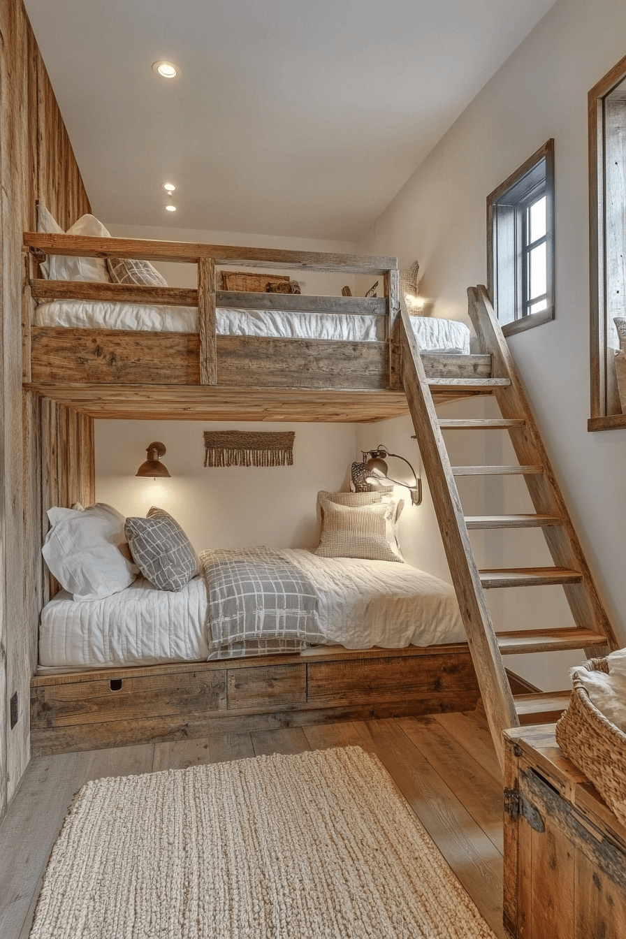 Warm materials and thoughtful layout define this welcoming retreat. Loft beds for small rooms blend coziness with function beautifully here. Built-in storage keeps the room tidy. The elevated bed frees valuable floor space. The room feels peaceful and practical.