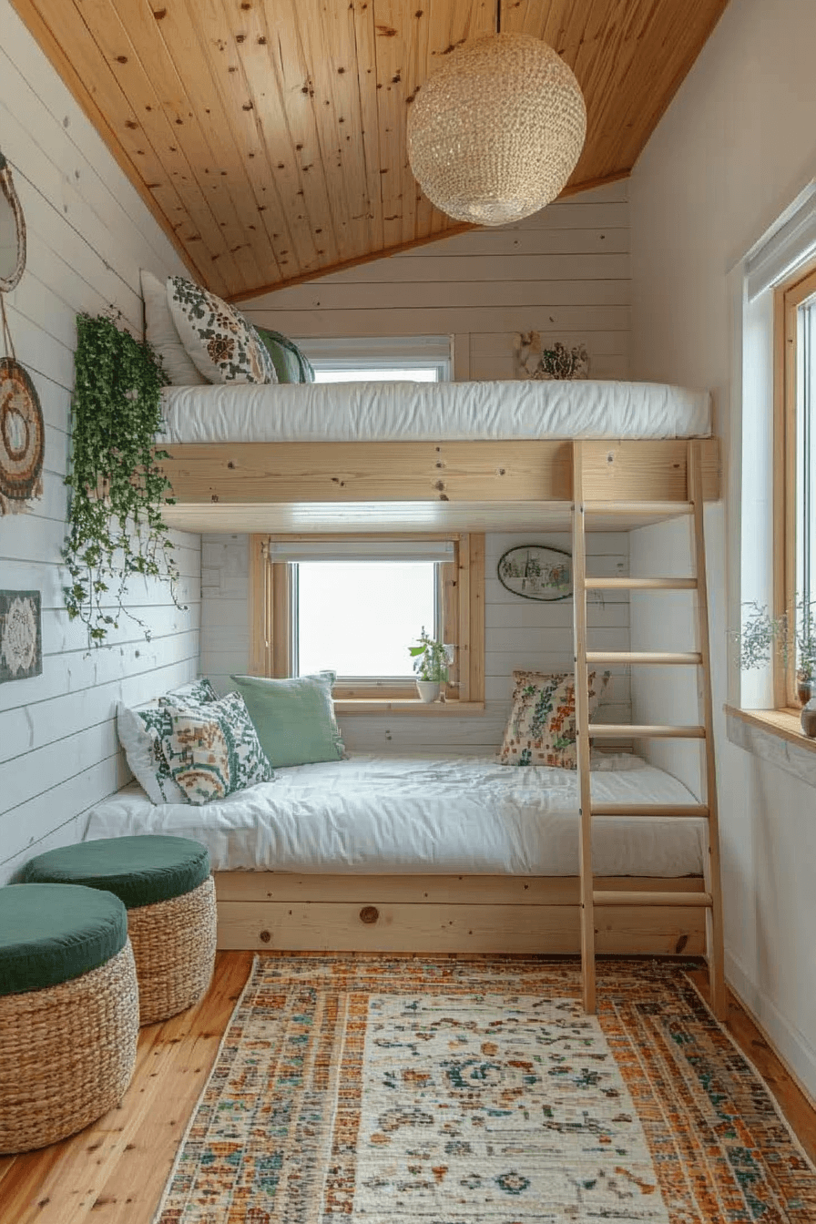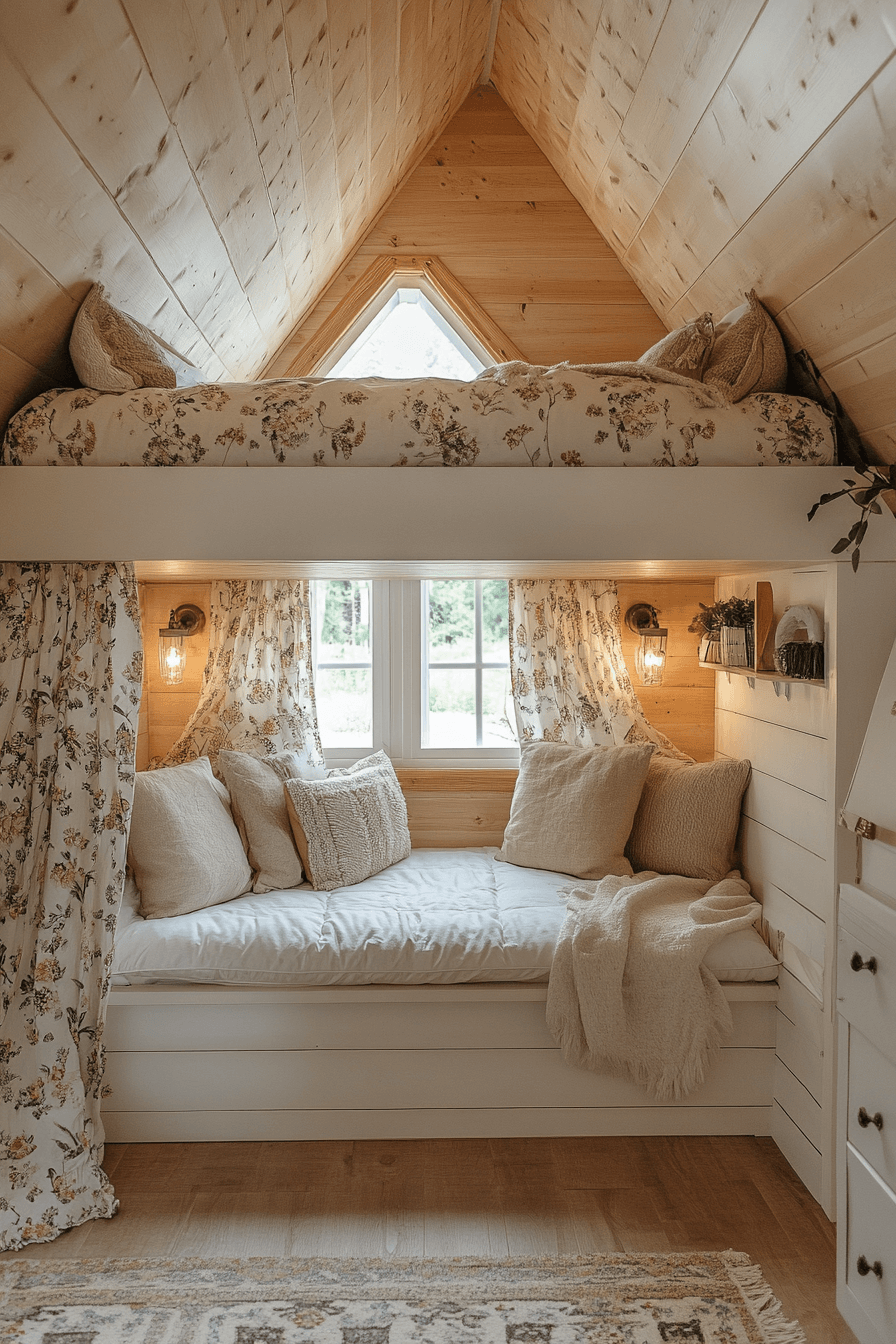 Cottage warmth softens this elevated bedroom with relaxed charm. Loft beds for small rooms feel inviting when natural finishes and cozy details are incorporated. The space below adapts easily for seating, storage, or play. Comfort and character shine through every detail. The room feels homey without feeling crowded.