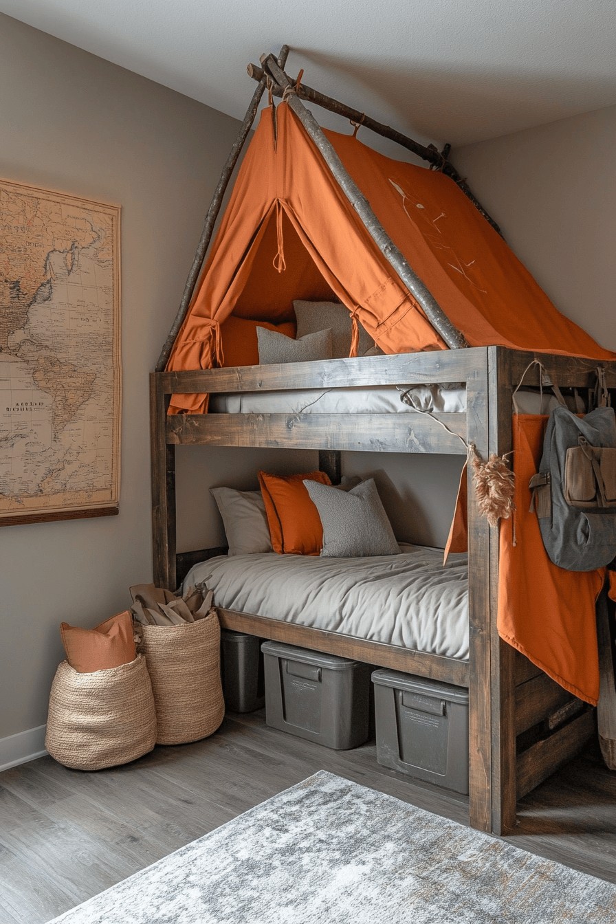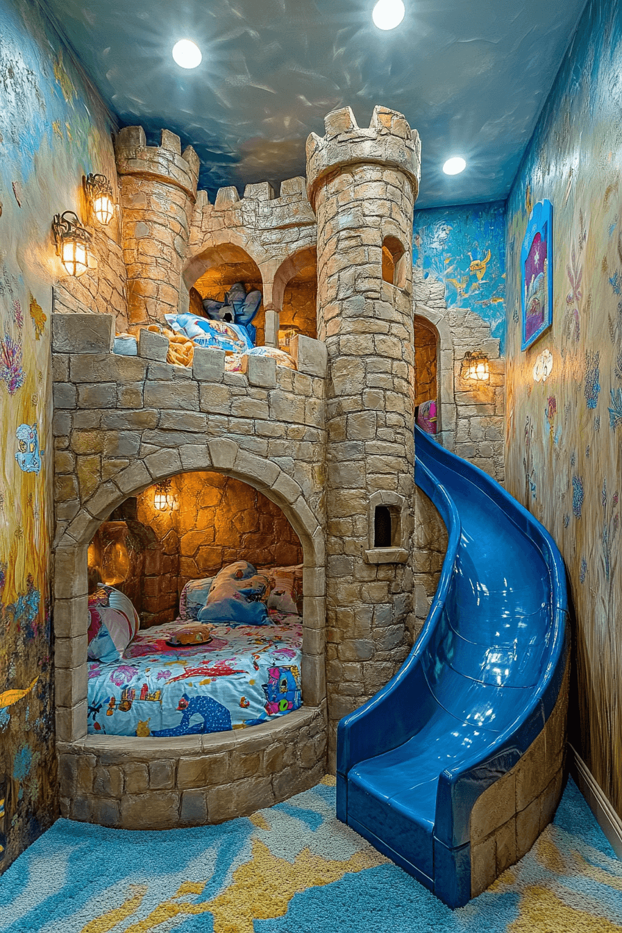 Energy and imagination meet in this lively bedroom setup. Loft beds for small rooms feel dynamic when playful themes inspire movement. The raised bed maintains order while activity thrives below. Decorative details add joy without clutter. The room feels balanced and fun.