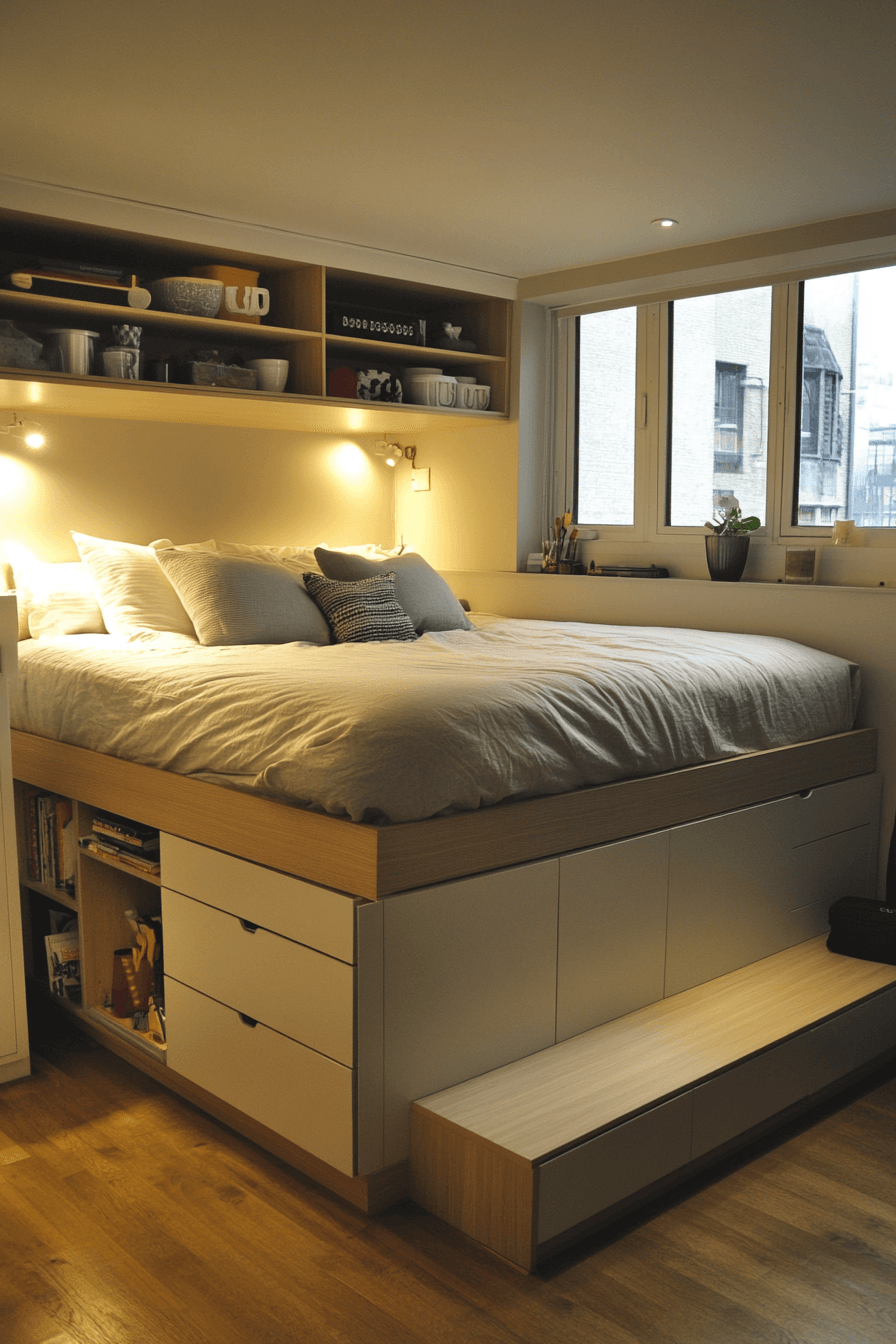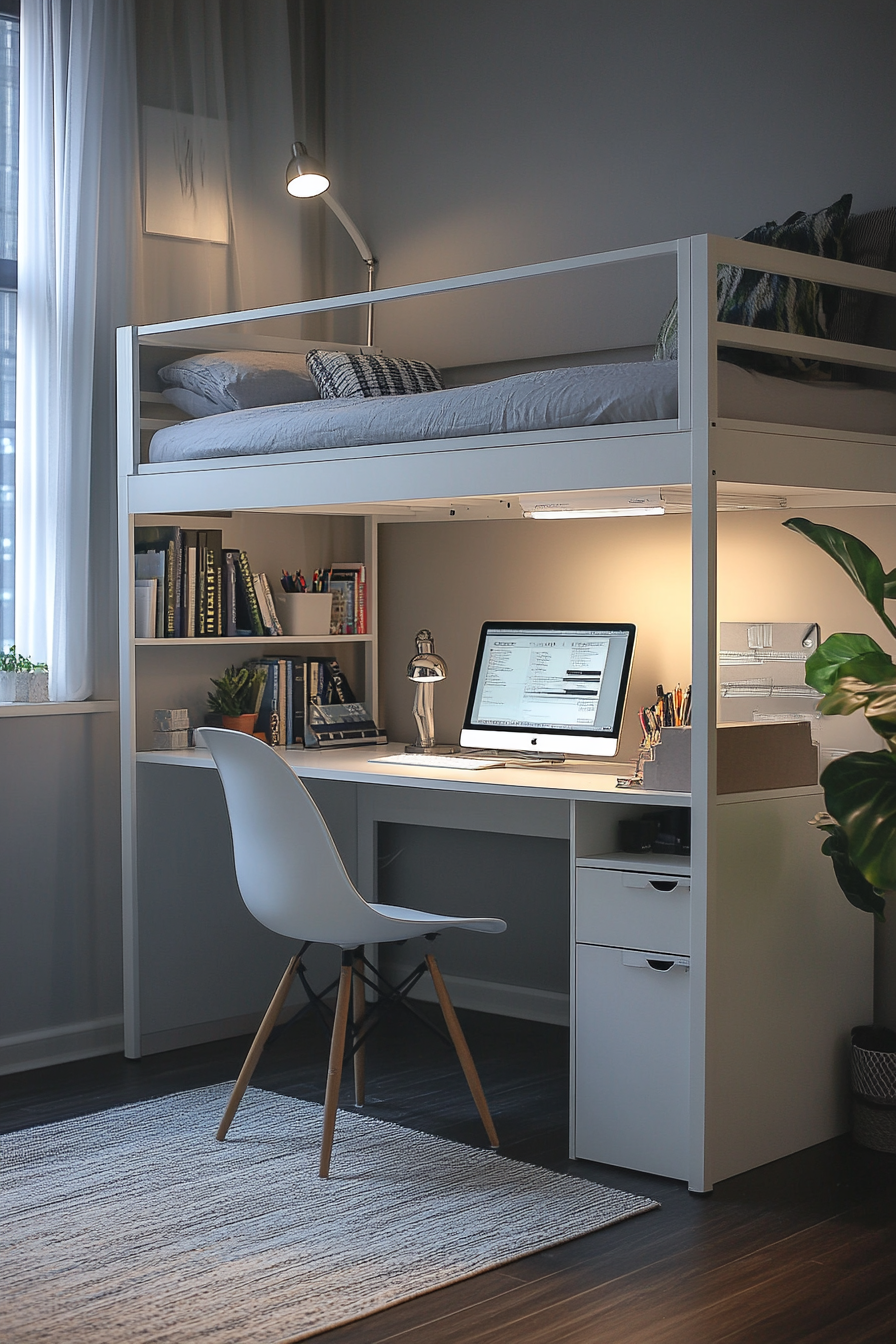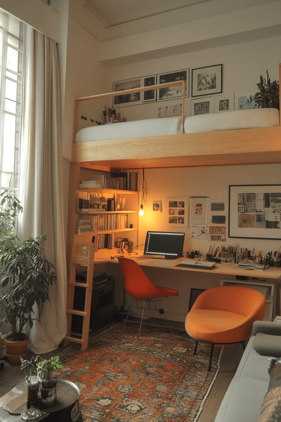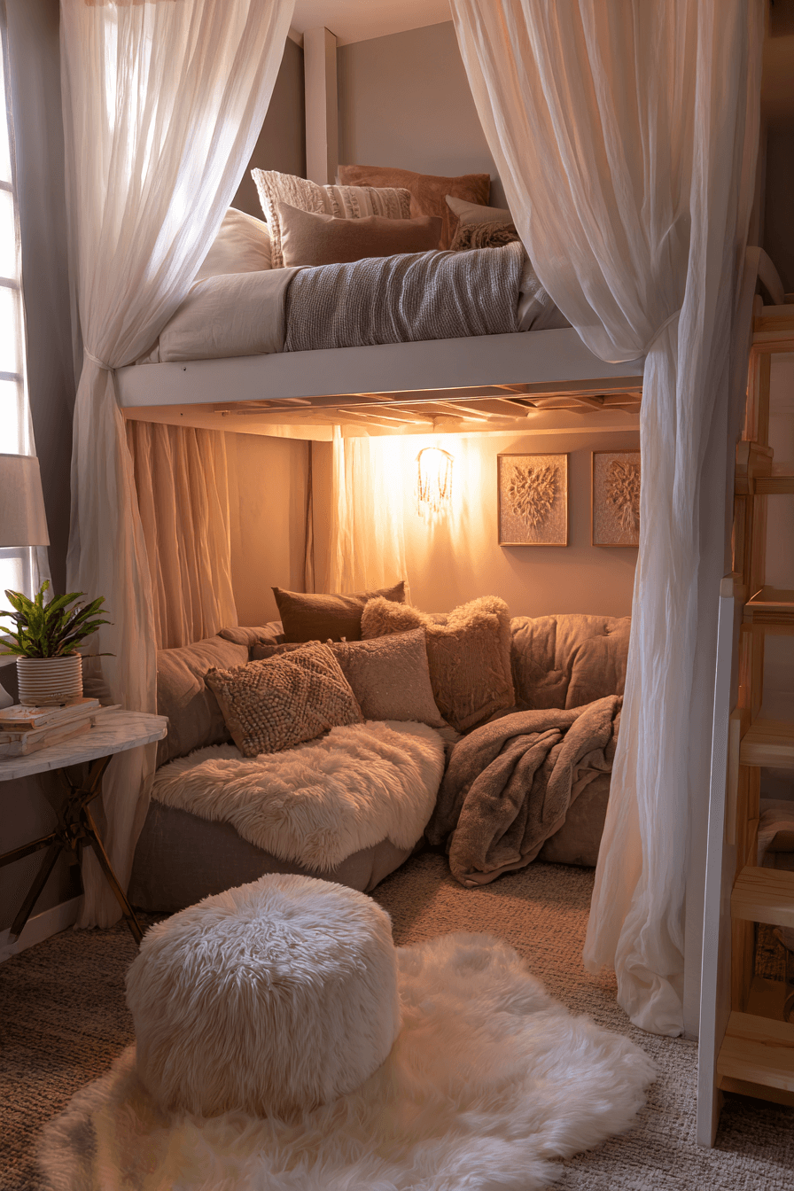 Soft layers and thoughtful lighting make this layout feel comforting and secure. Loft beds for small rooms feel especially welcoming when textures and warmth are carefully added. The raised sleeping area offers privacy while maintaining openness. A cozy zone below invites rest and relaxation. The room feels calm, safe, and intentional.