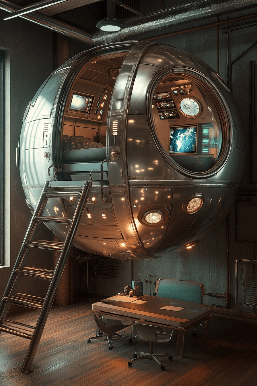 A cozy capsule feel defines this private and modern setup. Loft beds for small rooms feel special when enclosed forms create a personal retreat. Built-in lighting enhances both comfort and atmosphere. The space feels intimate yet efficient. Privacy and function blend beautifully.