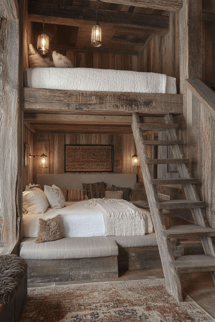 Natural textures add warmth to this efficient design. Loft beds for small rooms feel grounded when rustic finishes soften the structure. The space below supports seating or storage comfortably. Earthy elements bring balance and calm. Comfort and practicality coexist.