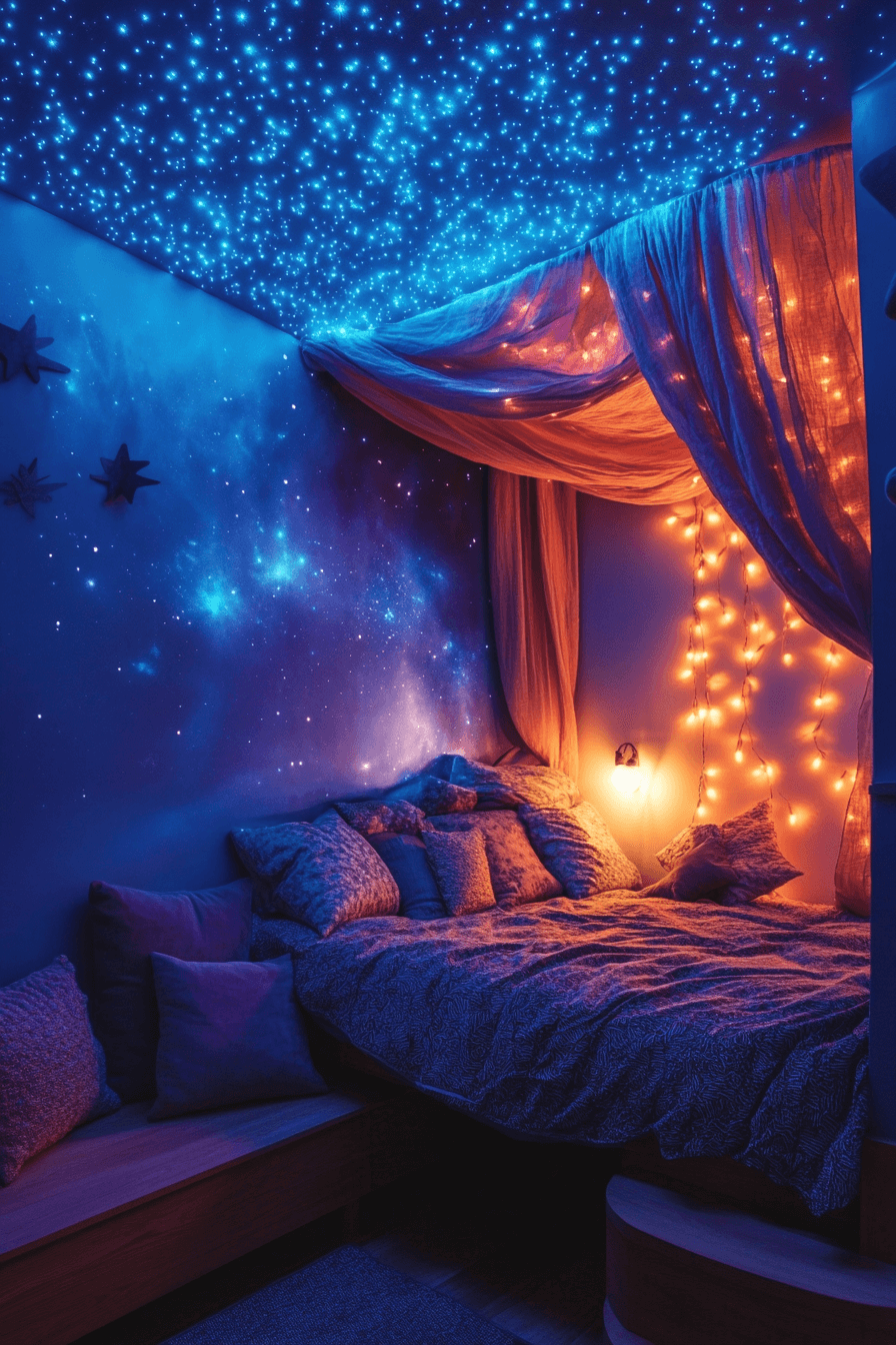 Ambient lighting brings a dreamy mood to this elevated sleep space. Loft beds for small rooms feel magical when gentle illumination enhances bedtime routines. The raised bed becomes a calming focal point. Soft light creates comfort and peace. The room supports rest and imagination alike.