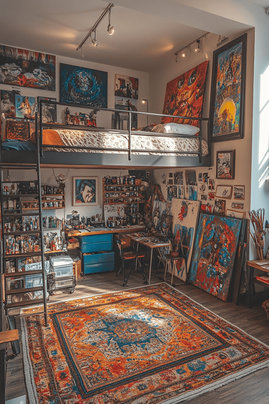 Creative flow defines this efficient and inspiring layout. Loft beds for small rooms allow work and rest to coexist without crowding the space. Built-in desks and storage keep supplies organized. Clear separation helps maintain focus and balance. The room supports creativity naturally.