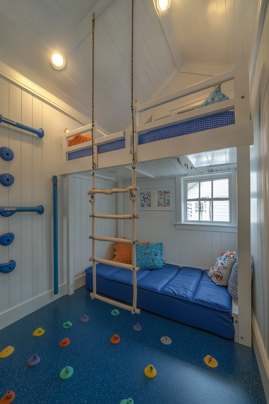 Movement-friendly features bring energy to this active design. Loft beds for small rooms support motion when fitness elements are built in safely. The lower space stays organized and functional. Activity and structure work together. Safety remains key.