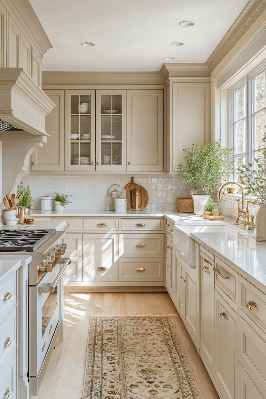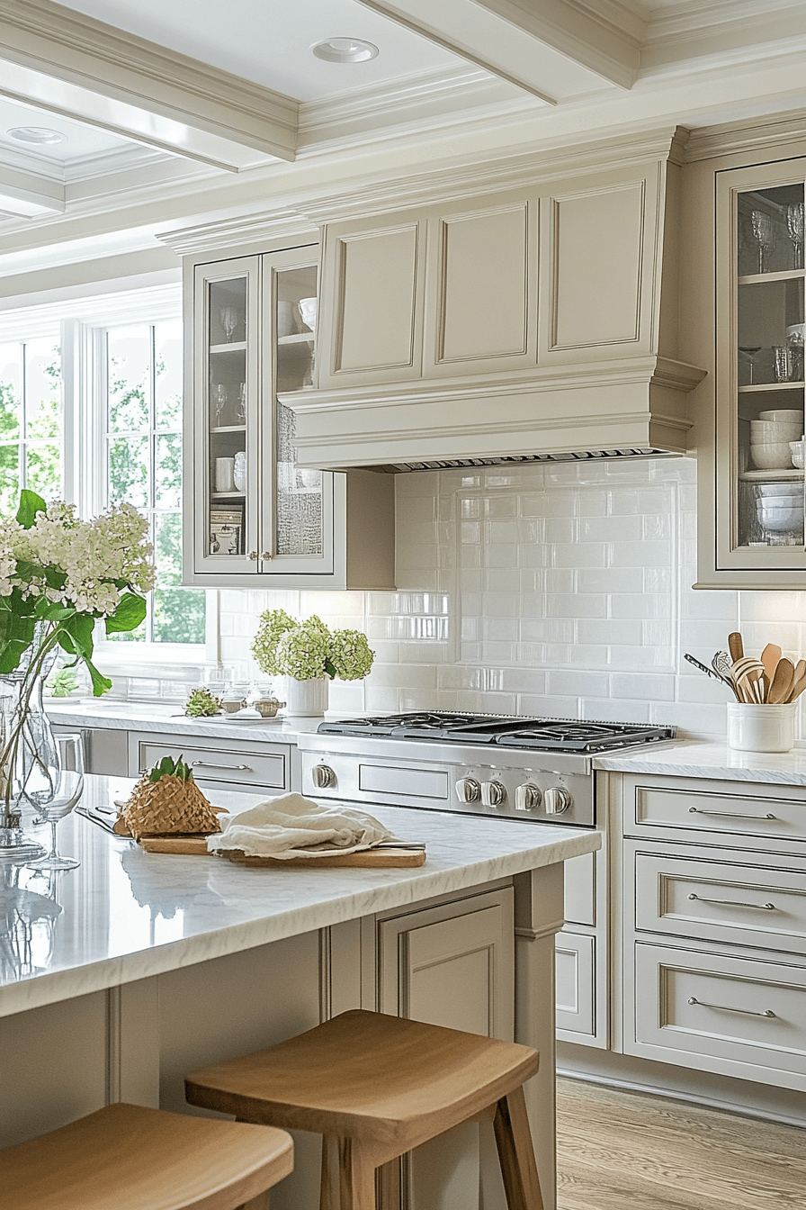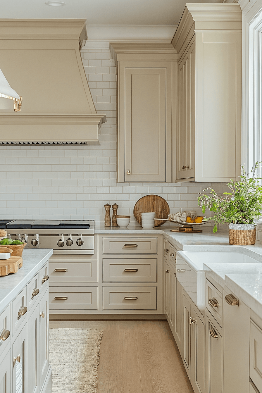 Linen-inspired neutral kitchen cabinets offer a breezy, light-filled look that feels timeless. The soft tone enhances openness and brightness. These cabinets complement everything from coastal to modern styles. The backdrop remains fresh year after year.