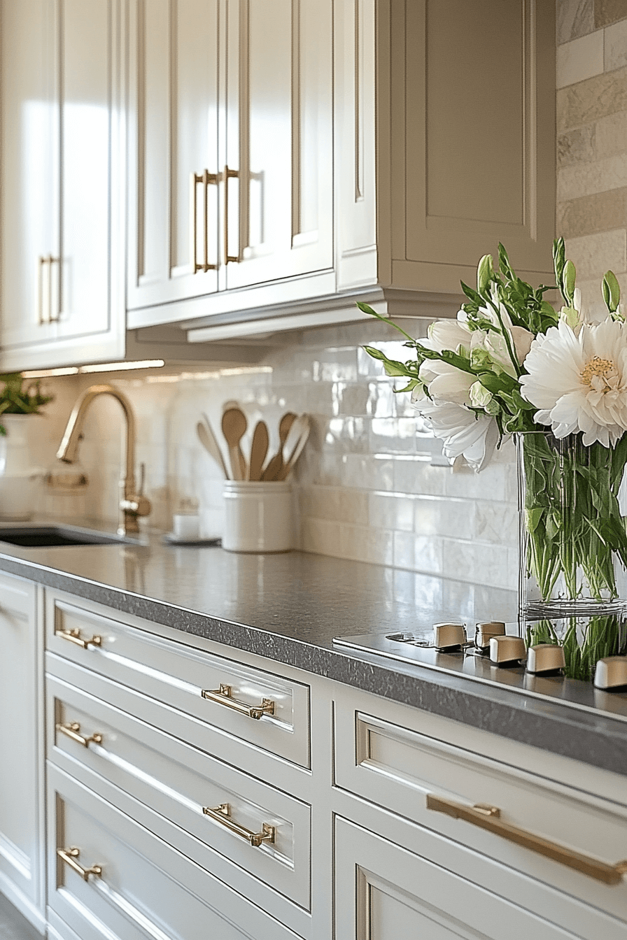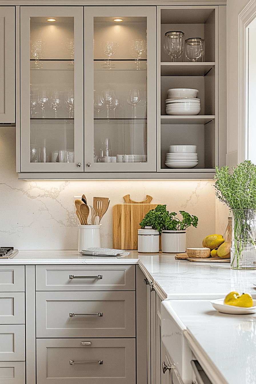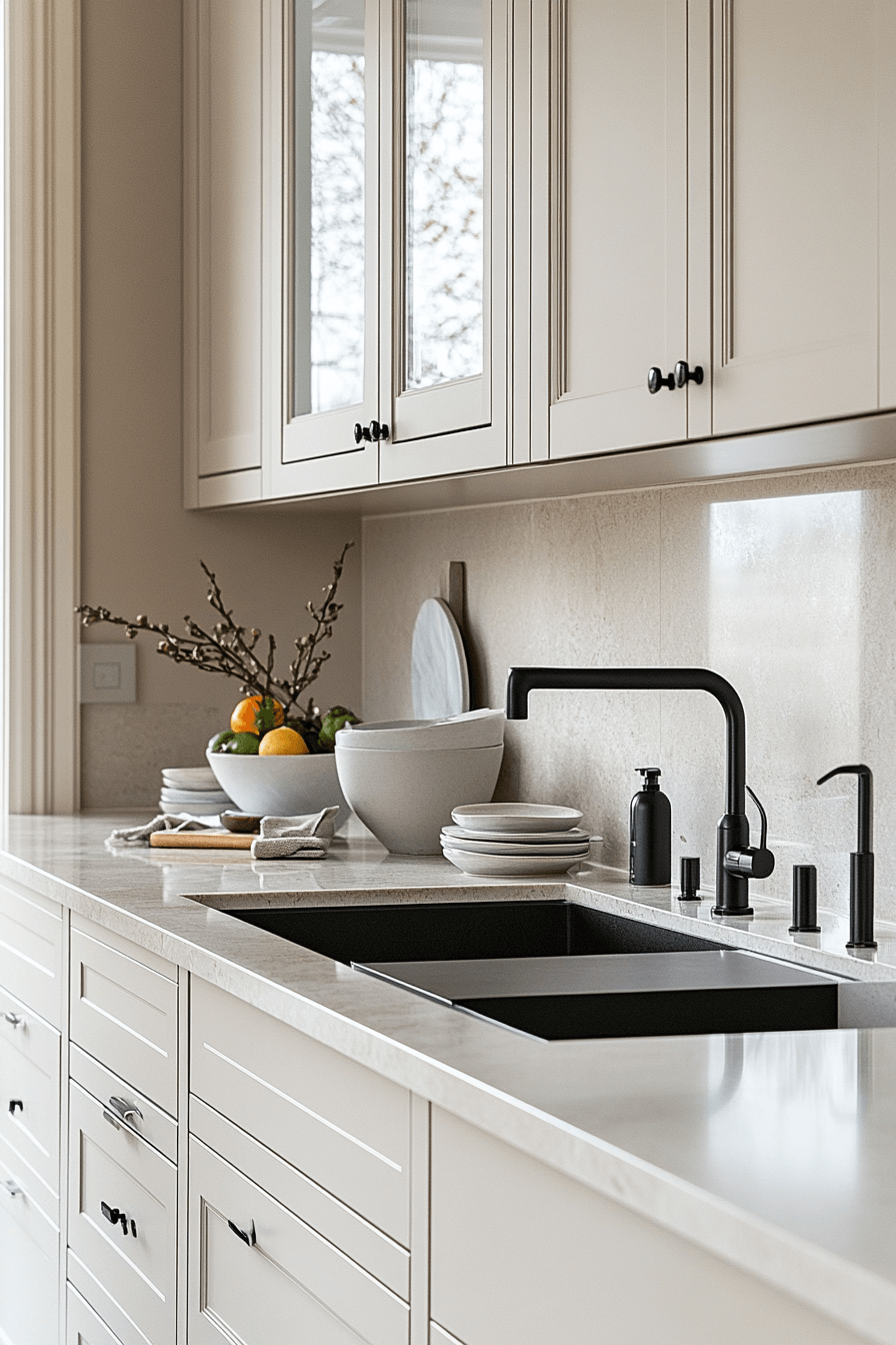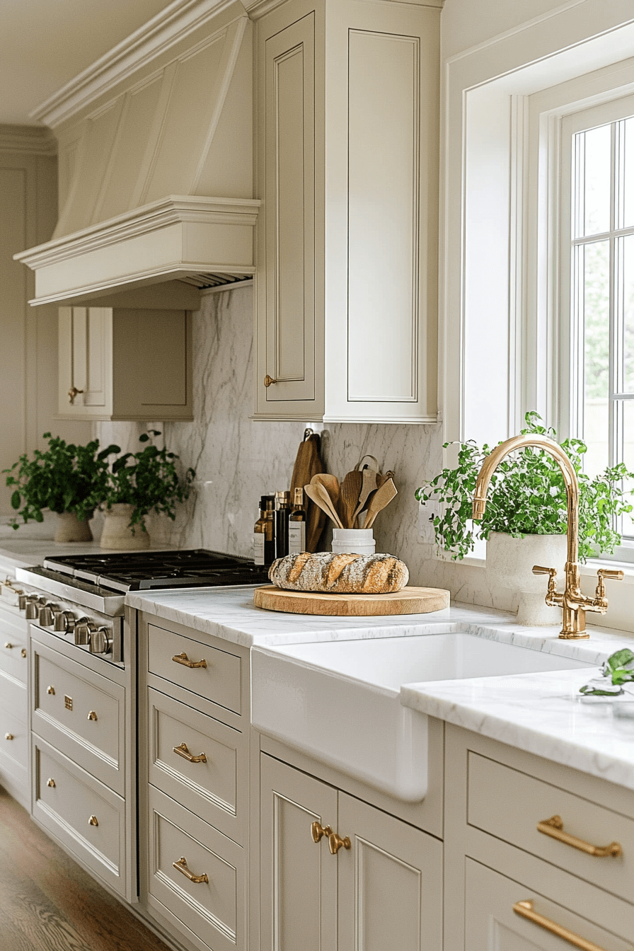 Linen-inspired neutral kitchen cabinets offer a breezy, light-filled look that feels timeless. The soft tone enhances openness and brightness. These cabinets complement everything from coastal to modern styles. The backdrop remains fresh year after year.