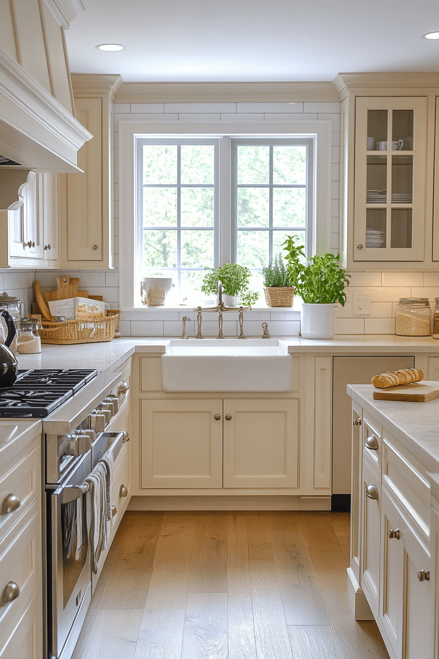 Milky off-white neutral kitchen cabinets add warmth while preserving a clean, bright appearance. The tone feels softer than stark white, making the kitchen more comfortable and inviting. It blends easily with farmhouse, transitional, and modern styles. The space feels cozy yet fresh. This shade offers the best of both worlds.
