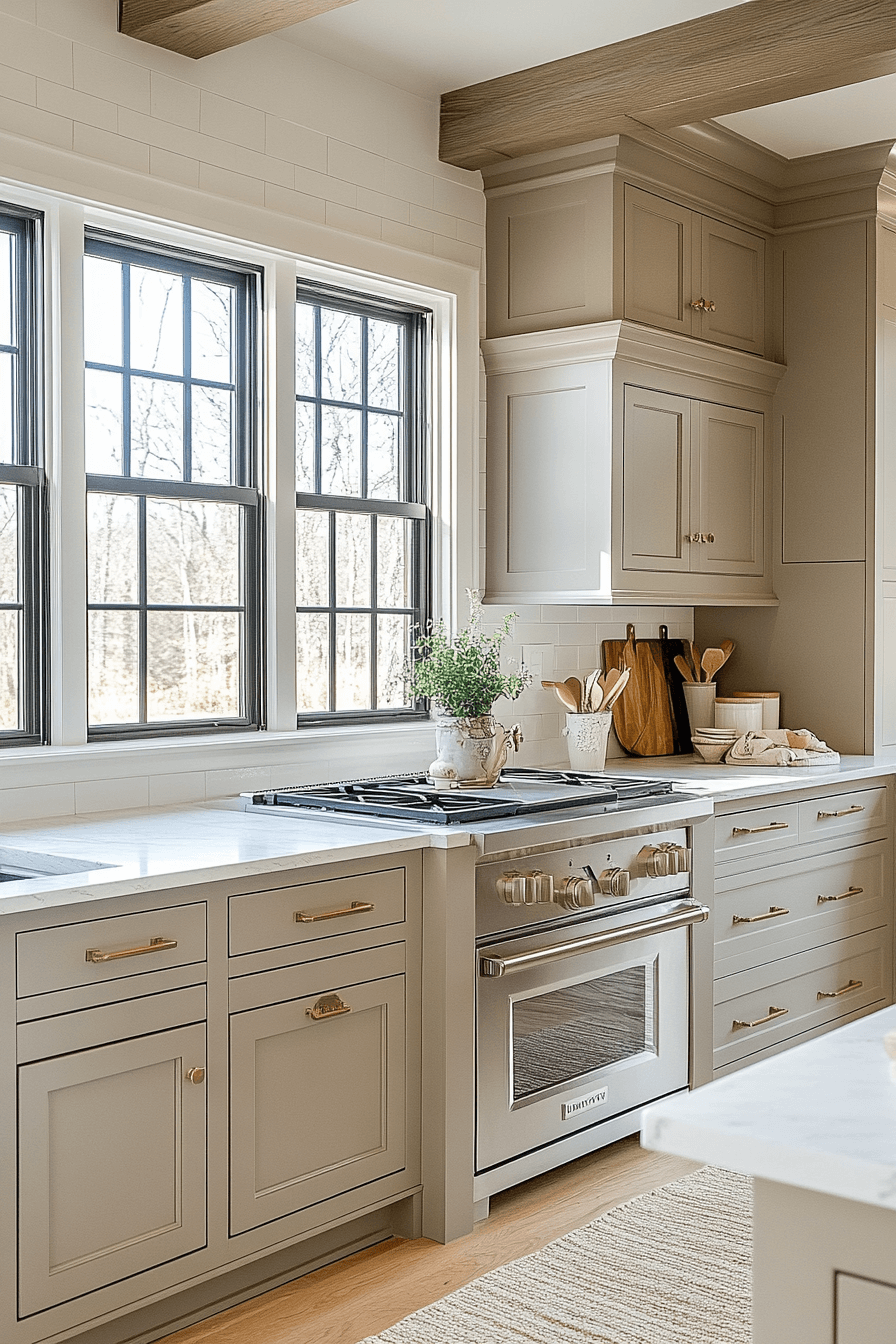 Taupe neutral kitchen cabinets ground the kitchen with warmth and quiet sophistication. The richer neutral adds depth while remaining flexible for changing decor. This shade works beautifully across rustic, transitional, and modern designs. Everyday wear blends in effortlessly, keeping maintenance stress low. The space feels inviting and layered.