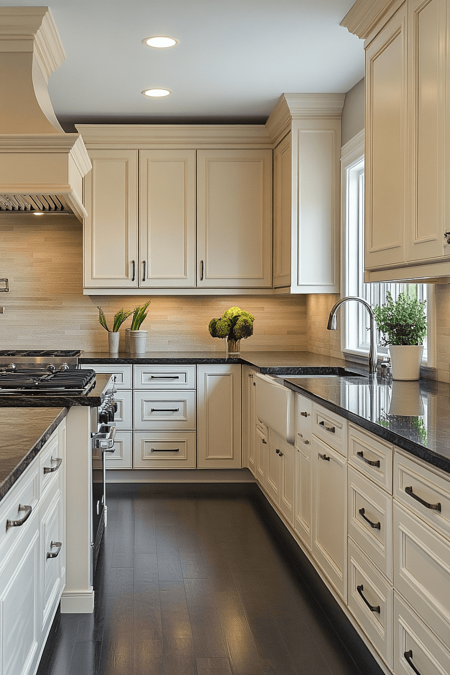 Sepia-inspired neutral kitchen cabinets blend nostalgic warmth with modern refinement. The deeper beige tone adds richness without going dark. Updated fixtures keep the look fresh and current. This shade creates an inviting setting for cooking and entertaining. Character fills the room naturally.