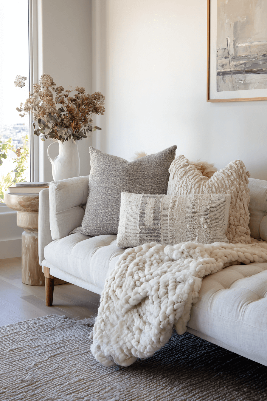 Soft natural fabrics help organic modern decor feel more welcoming by adding comfort and texture in a subtle, elevated way. Linen, boucle, wool, and cotton all bring a tactile richness that softens cleaner lines and modern surfaces. These materials work beautifully through curtains, throws, rugs, and pillows without making the room feel overdone. Their breathable and relaxed quality supports the calm mood this style is known for. The final effect is cozy, refined, and beautifully effortless. Explore more organic modern decor ideas featuring soft and natural textile layers!