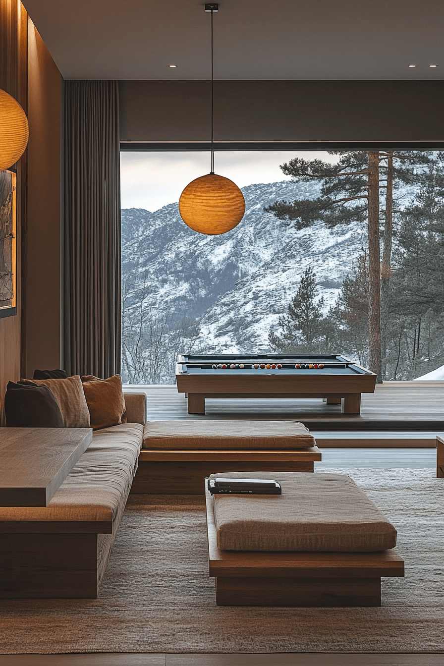The Scandinavian Japanese interior game room blends play with presence. Smooth wood tones and neutral walls ground moments of excitement. The minimalist design keeps joy uncluttered and free-flowing.