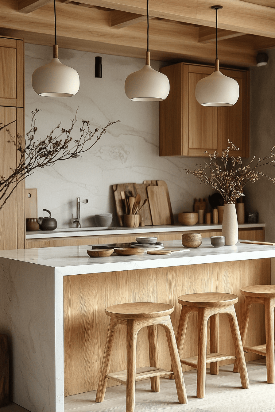 In this Scandinavian Japanese interior kitchen, light and balance reign supreme. Clean counters and smooth wood textures create a grounded rhythm that soothes the senses. Every pot, cup, and utensil has a quiet beauty, serving both form and function. The space feels like calm in motion—minimal yet nurturing.