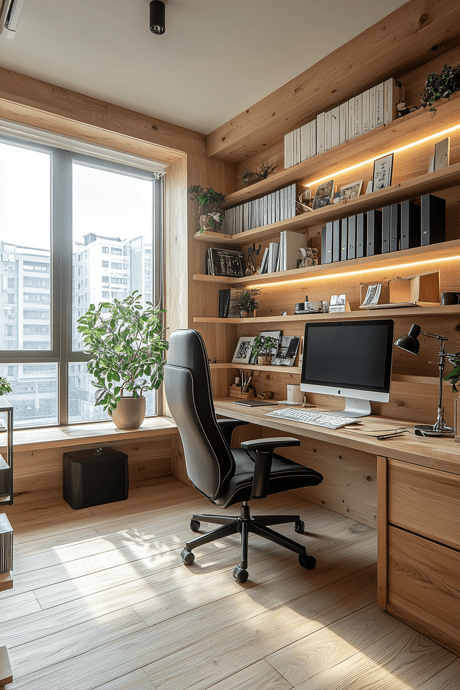 This Scandinavian Japanese interior workspace turns focus into art. Smooth wooden desks and delicate accents inspire clarity and purpose. Natural light moves softly across minimalist forms, creating an atmosphere of balance. Each element has space to breathe, freeing your thoughts to flow.