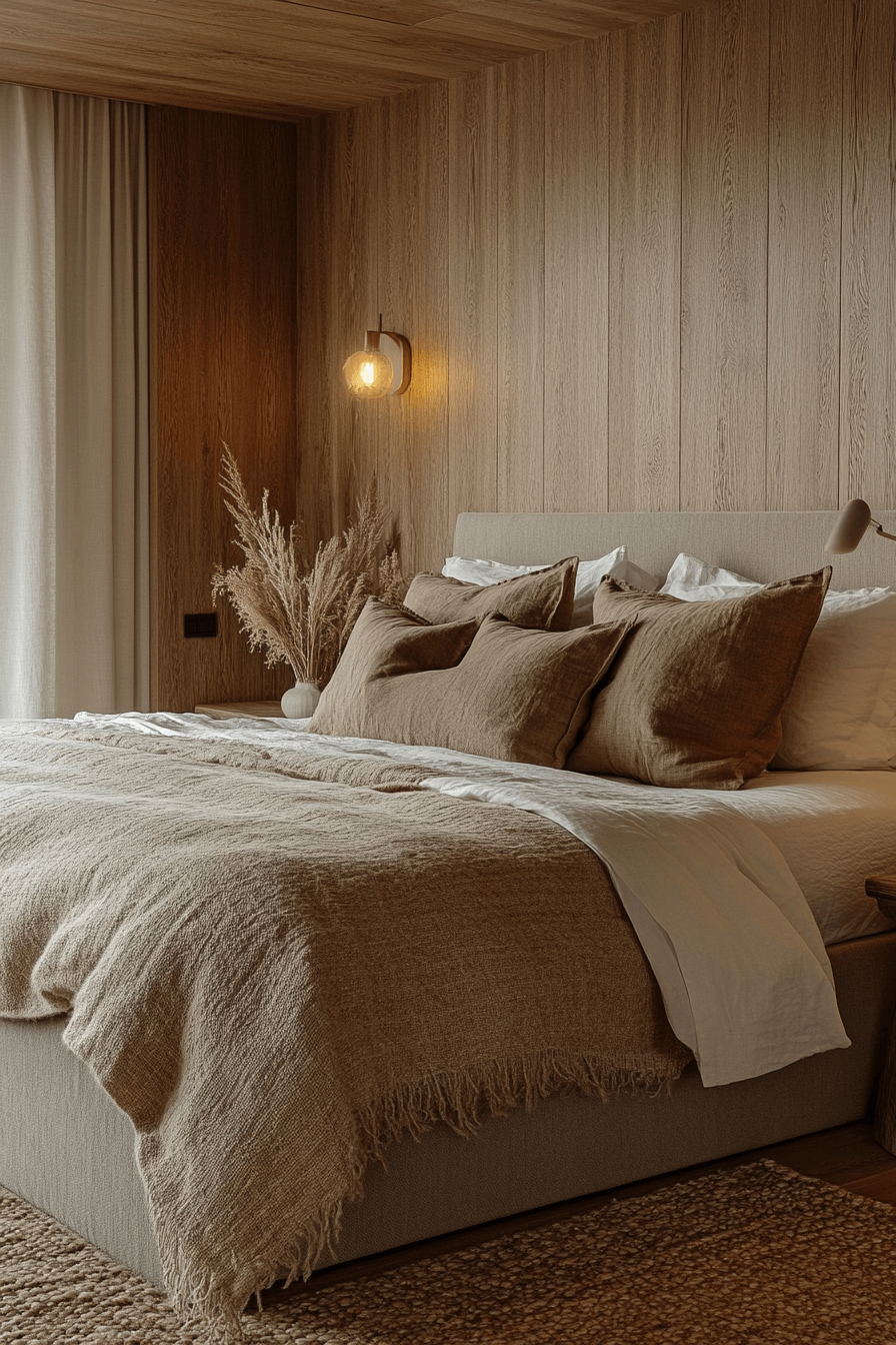 The Scandinavian Japanese interior bedroom feels like a soft sigh at the end of the day. Linen sheets, warm wood, and soft shadows create an oasis for rest. Nothing competes—every texture and tone speaks gently. The room hums with calm energy, grounded yet airy.
