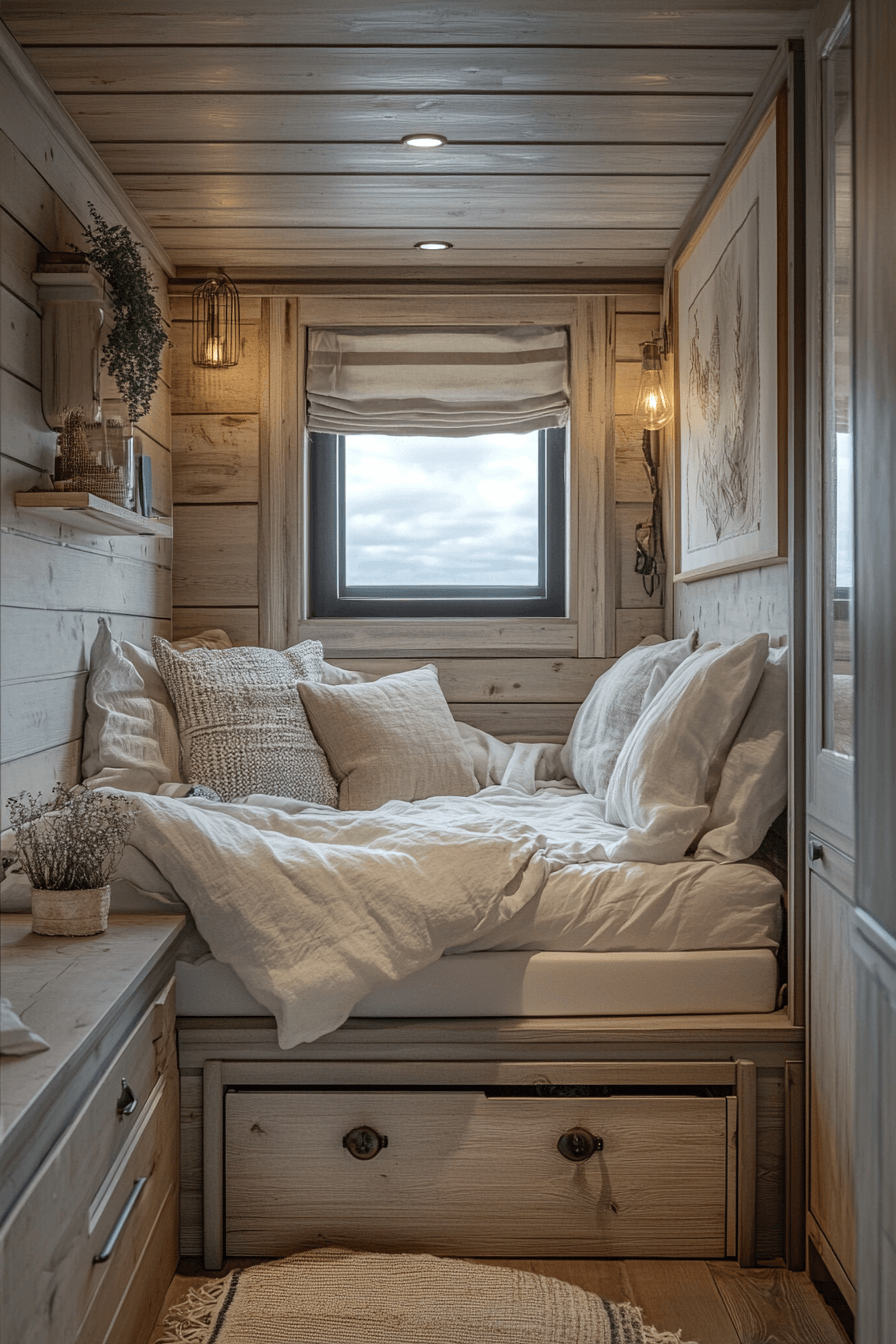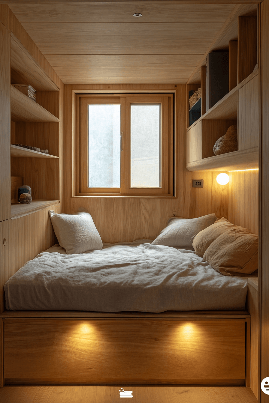 Under-bed storage is a beautiful solution for tiny bedroom decor because it makes the sleeping zone work harder without adding visual bulk. Lift-up platforms and hidden drawers create room for clothing, linens, and extra essentials while keeping them out of sight. This works wonderfully in tiny bedroom decor because it reduces clutter and protects valuable floor space. The streamlined bed shape also helps the room feel modern and neat. Paired with soft tones and layered textiles, the setup feels calm and practical. Click to see more creative tiny bedroom decor storage ideas!