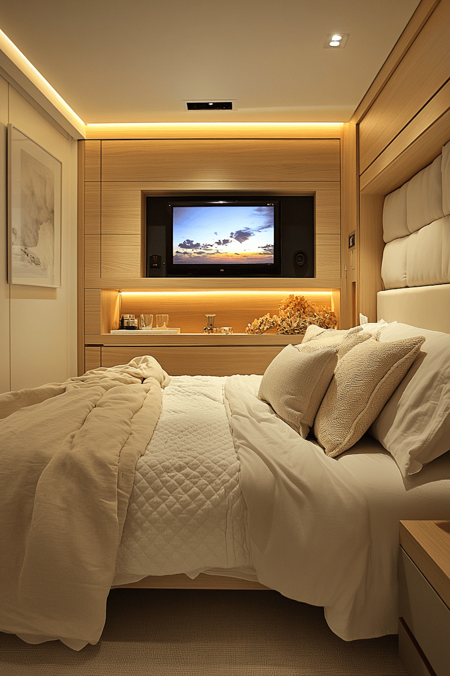A sleek media wall can keep tiny bedroom decor feeling organized by reducing bulk around entertainment pieces. Mounted screens and hidden cables help maintain clean surfaces and a more open layout. This works beautifully in tiny bedroom decor because it removes the need for heavy furniture pieces. Slim wall shelves can still add room for decor or essentials without overwhelming the space. The final design feels polished, modern, and efficient. Tap here to discover more space-saving media wall ideas for tiny bedroom decor!