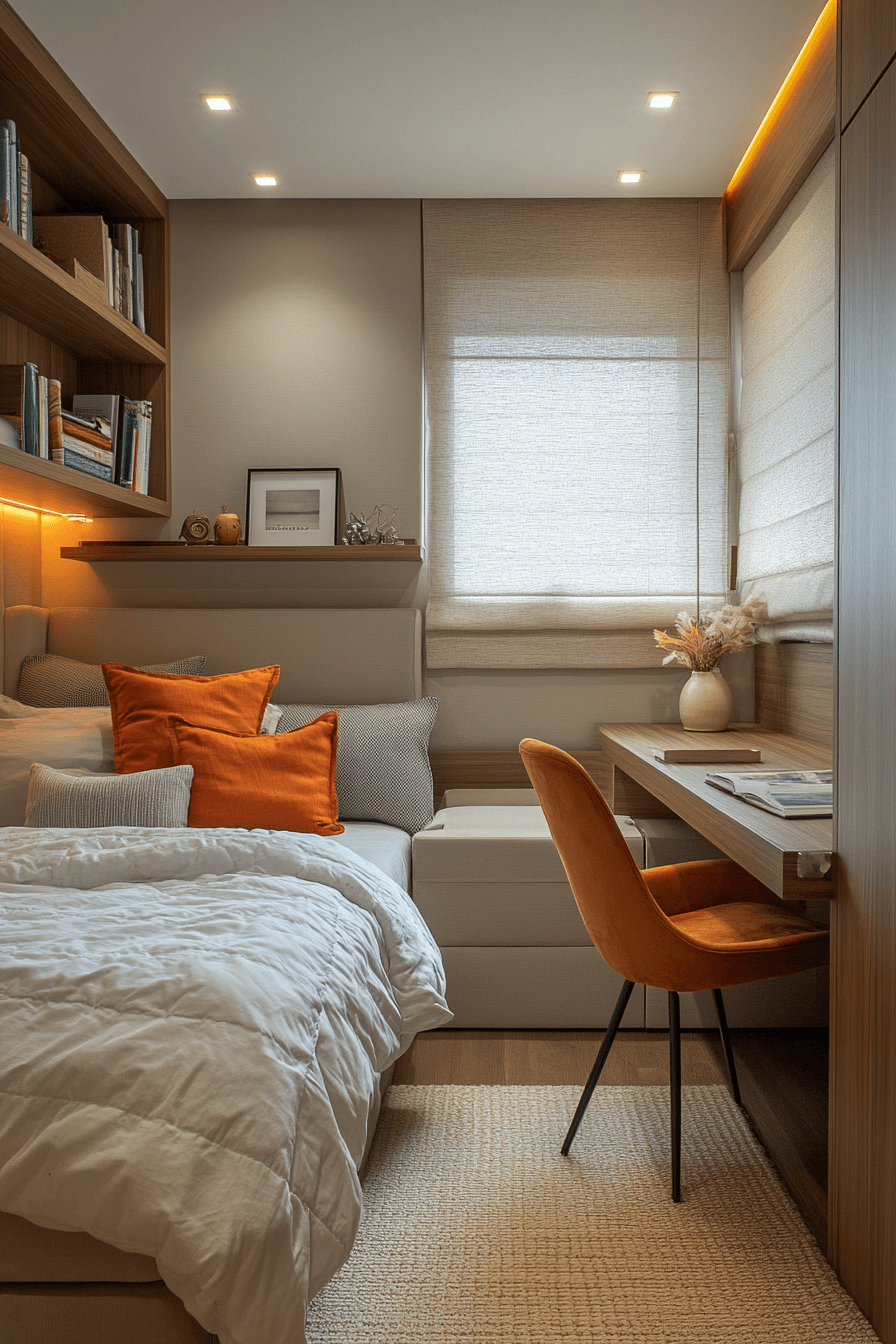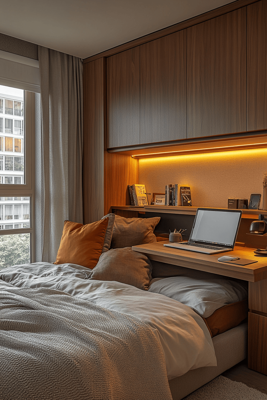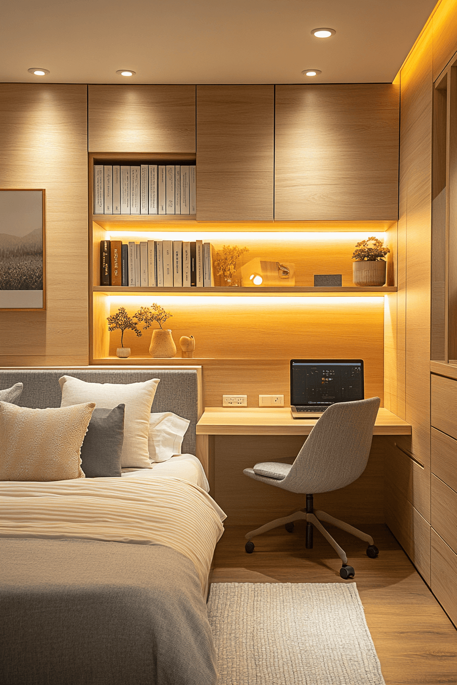 A pull-out desk is a clever feature in tiny bedroom decor because it gives you a workspace only when you need it. Hidden or sliding desk surfaces can stay tucked away most of the time, keeping the room visually open. This works beautifully in tiny bedroom decor because it adds function without permanent bulk. The bedroom feels less busy, but still supports work or study when necessary. The final result is flexible, neat, and very practical. Click here to explore more flexible tiny bedroom decor workspace ideas!