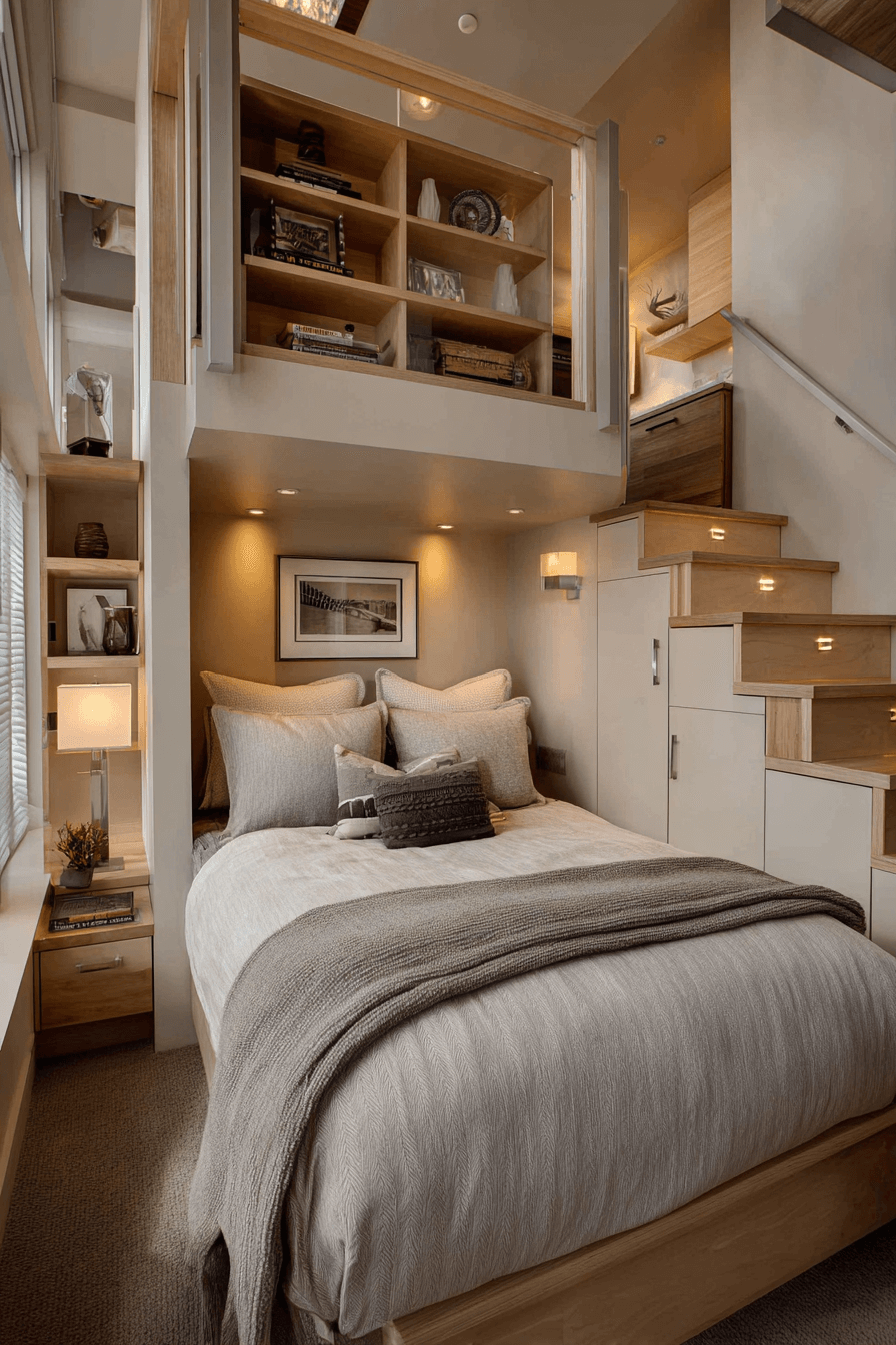A space-smart bed setup is one of the most effective ways to improve tiny bedroom decor without losing comfort. Beds with slimmer frames, built-in drawers, or compact silhouettes help the room feel more open and easier to move through. This works especially well in tiny bedroom decor because the sleeping area stays cozy while the layout feels less crowded. Soft bedding, warm lighting, and a few simple accents keep the room inviting instead of bare. The final result feels efficient, stylish, and restful. Tap to explore more smart tiny bedroom decor ideas!