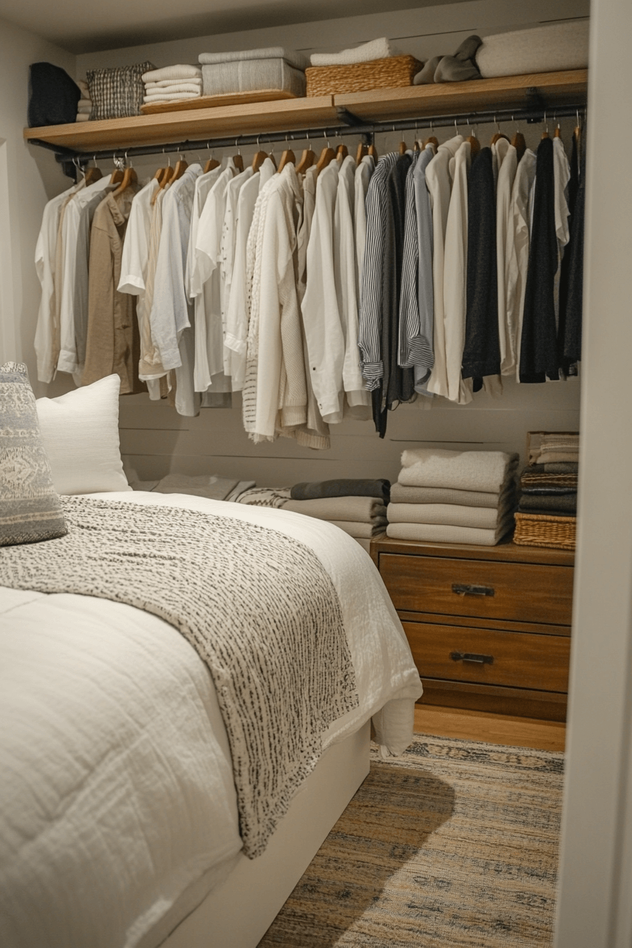 An open hanging rail is a simple and modern way to support tiny bedroom decor without the heaviness of a full wardrobe. Mounted rails keep clothing accessible while helping the room feel lighter and more breathable. This works especially well in tiny bedroom decor because it reduces bulk and supports a more edited layout. With coordinated hangers and neat styling, the rail becomes part of the room’s design. The result is airy, practical, and stylish. Click to discover more smart closet ideas for tiny bedroom decor!