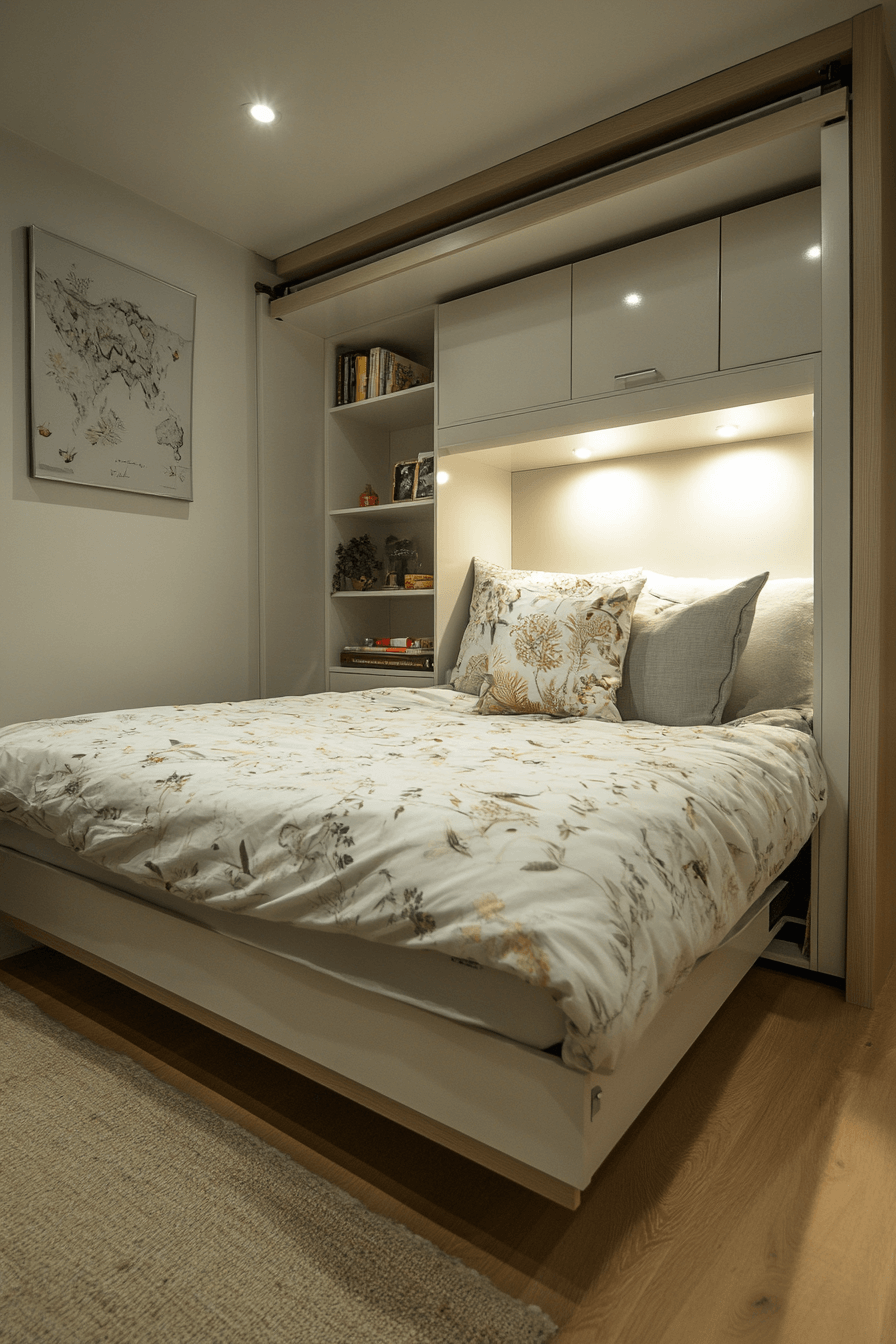 A fold-up wall bed is one of the most space-efficient ideas in tiny bedroom decor because it instantly opens the room when tucked away. This creates valuable daytime floor space for relaxing, moving around, or adding another function to the room. It works perfectly in tiny bedroom decor because it offers a real bed without a constant footprint. Many versions also include built-in shelves or work surfaces. The final effect is smart, modern, and highly efficient. Click to explore more clever wall bed tiny bedroom decor ideas!