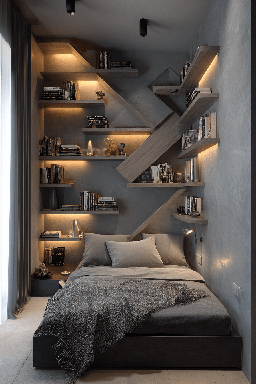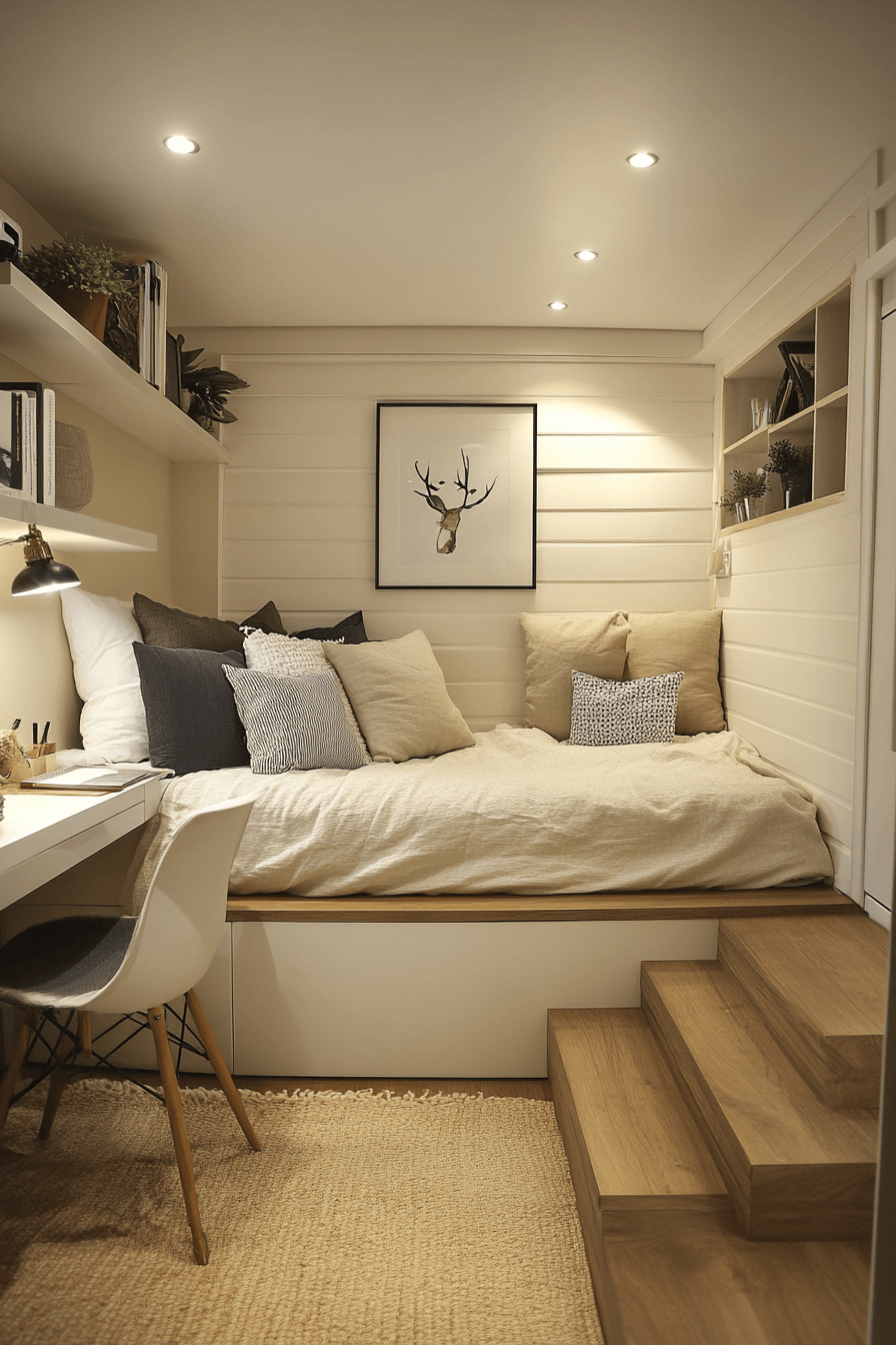 A tucked-away nook beneath the stairs is a creative way to make tiny bedroom decor feel both practical and charming. Instead of leaving that area unused, a bed can fit neatly into the space and create a cozy sleeping corner. This works beautifully in tiny bedroom decor because it uses architecture to your advantage. Built-in shelves, a reading light, and soft bedding help the nook feel intentional and complete. The final setup is snug, stylish, and surprisingly efficient. Tap to see more creative tiny bedroom decor nook ideas!