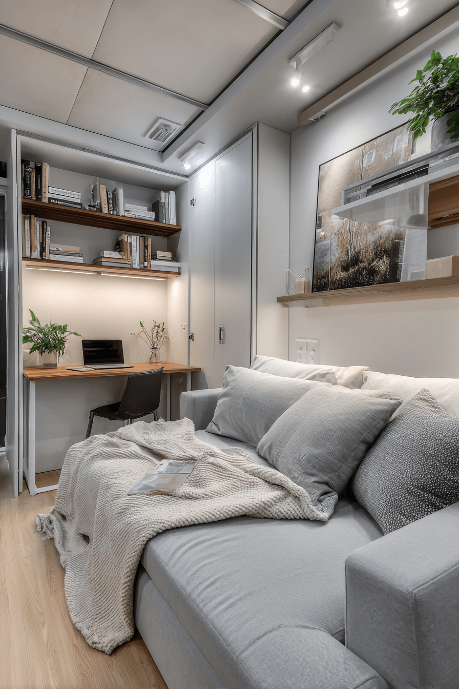 A Murphy bed system brings incredible flexibility to tiny bedroom decor by allowing the room to change throughout the day. When the bed folds away, the floor opens up for work, lounging, or simply enjoying more breathing room. This is ideal for tiny bedroom decor because it creates a multifunctional space without sacrificing sleep comfort. Many styles include shelves or built-ins that add even more usefulness. The final effect feels streamlined, versatile, and beautifully organized. Click to discover more multifunctional tiny bedroom decor furniture ideas!
